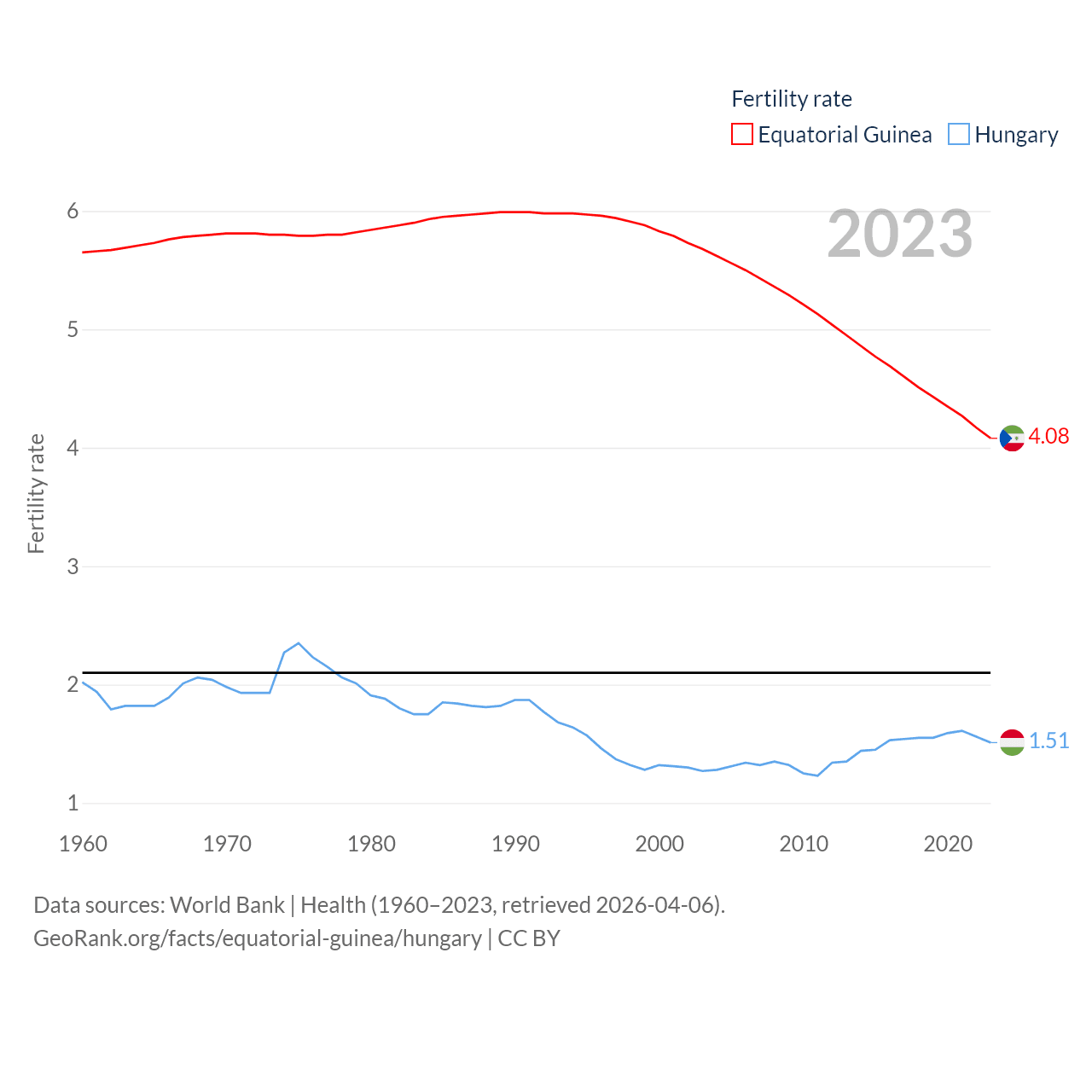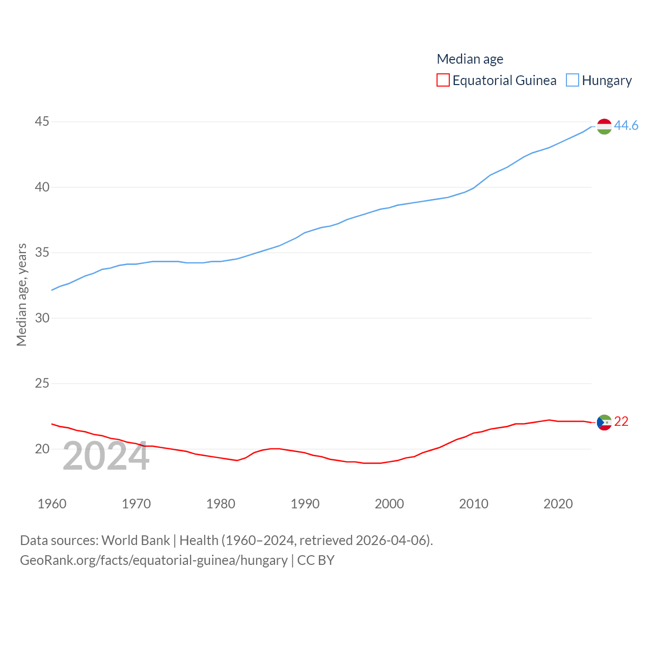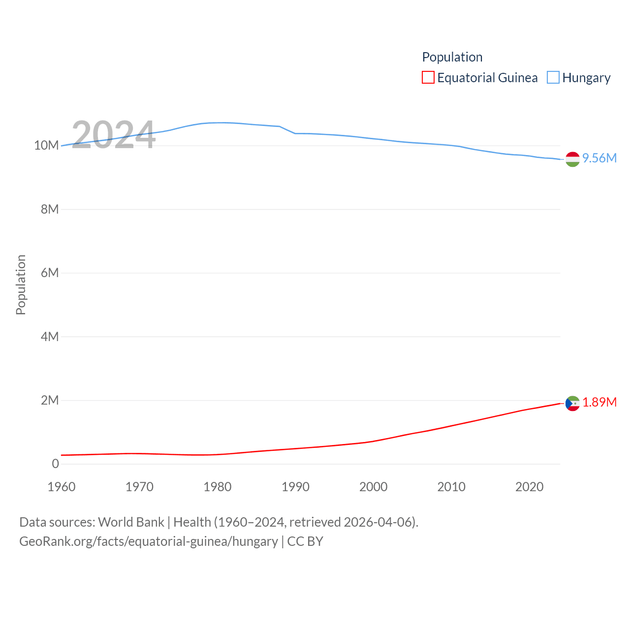 Equatorial Guinea has a population of 1.89M (ranked 148/197), compared with 9.56M in Hungary (ranked 97/197). Equatorial Guinea's land area is 10,830 sq mi versus 35,236 sq mi for Hungary (ranked 140th vs. 109th).