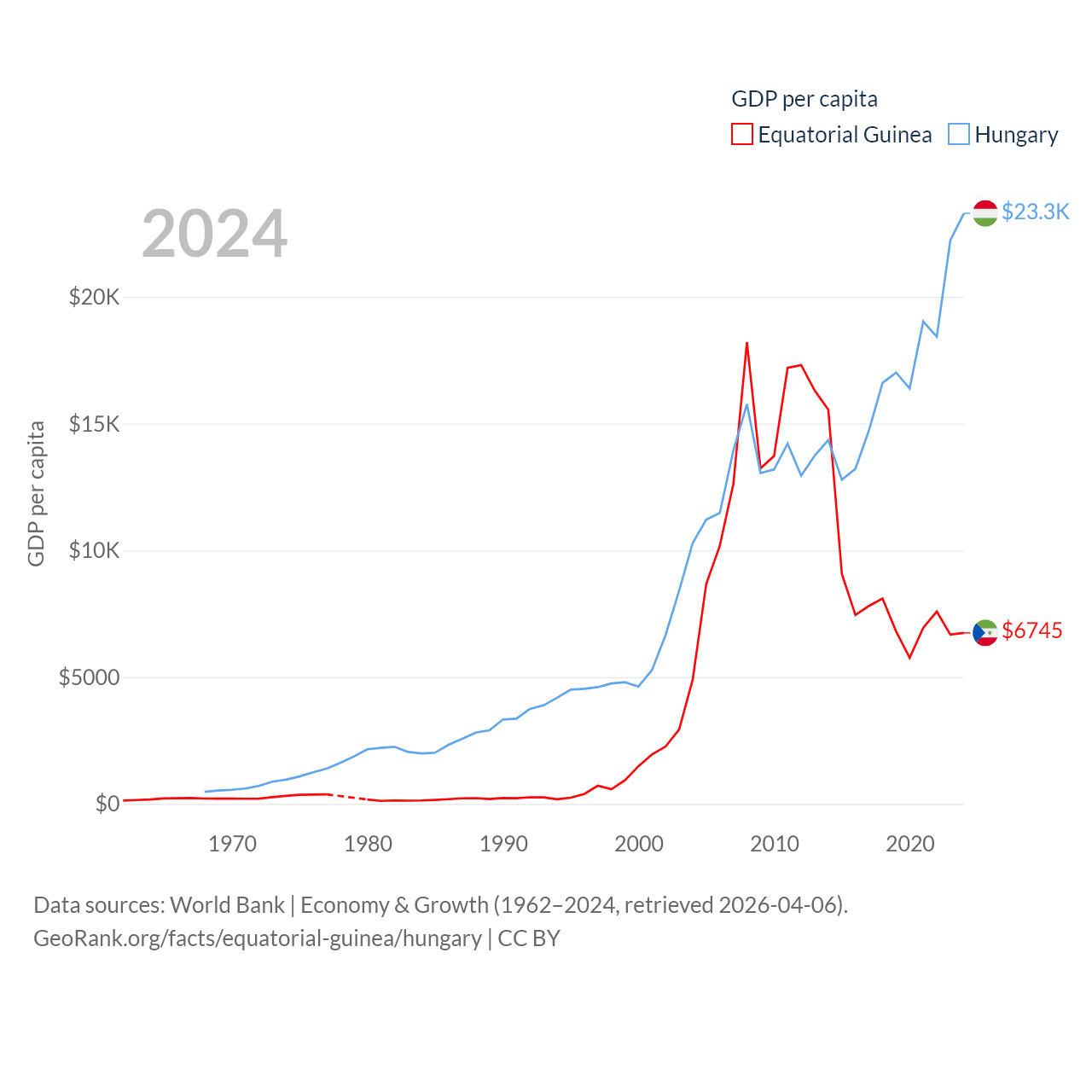 By GDP, Equatorial Guinea ranks 148/197 ($12.8B) and Hungary ranks 55/197 ($223B). By GDP per capita, Equatorial Guinea ranks 106/197 ($6,745), while Hungary ranks 55/197 ($23,292).