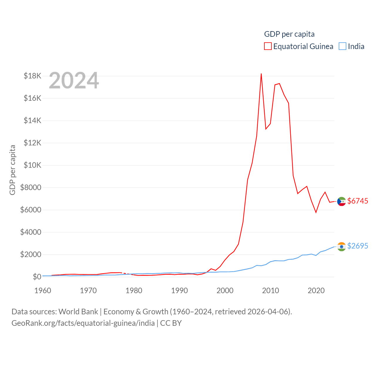 By GDP, Equatorial Guinea ranks 148/197 ($12.8B) and India ranks 5/197 ($3.91T). By GDP per capita, Equatorial Guinea ranks 106/197 ($6,745), while India ranks 143/197 ($2,695).