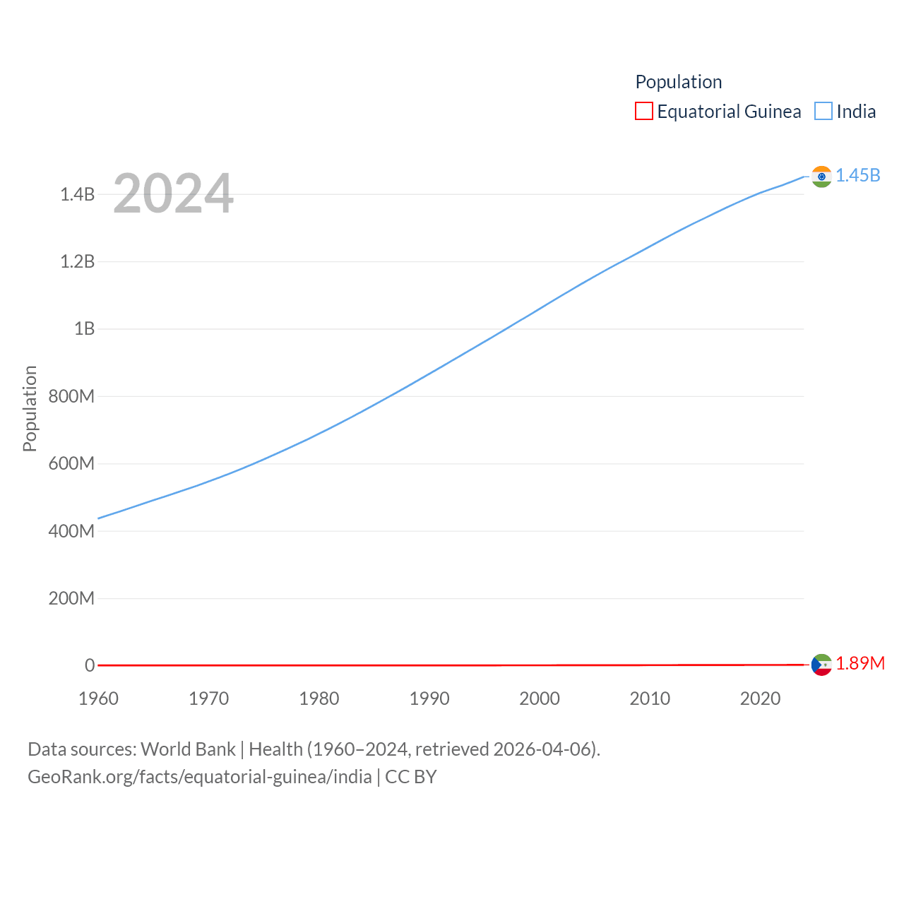 Equatorial Guinea has a population of 1.89M (ranked 148/197), compared with 1.45B in India (ranked 1/197). Equatorial Guinea's land area is 10,830 sq mi versus 1,147,955 sq mi for India (ranked 140th vs. 7th).