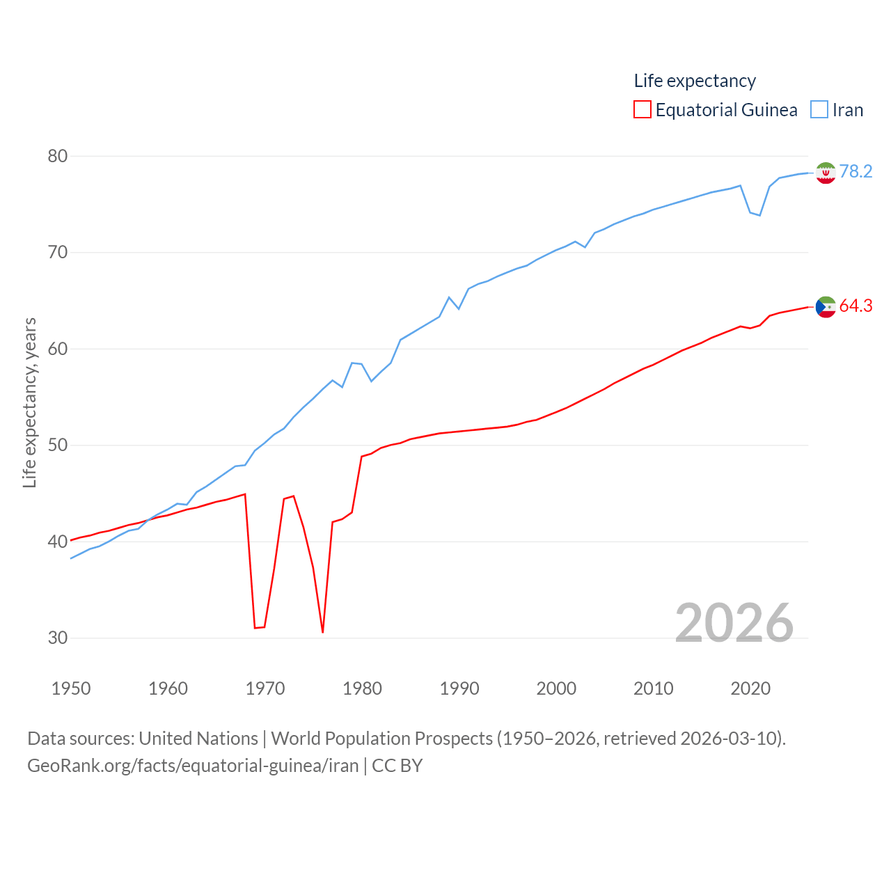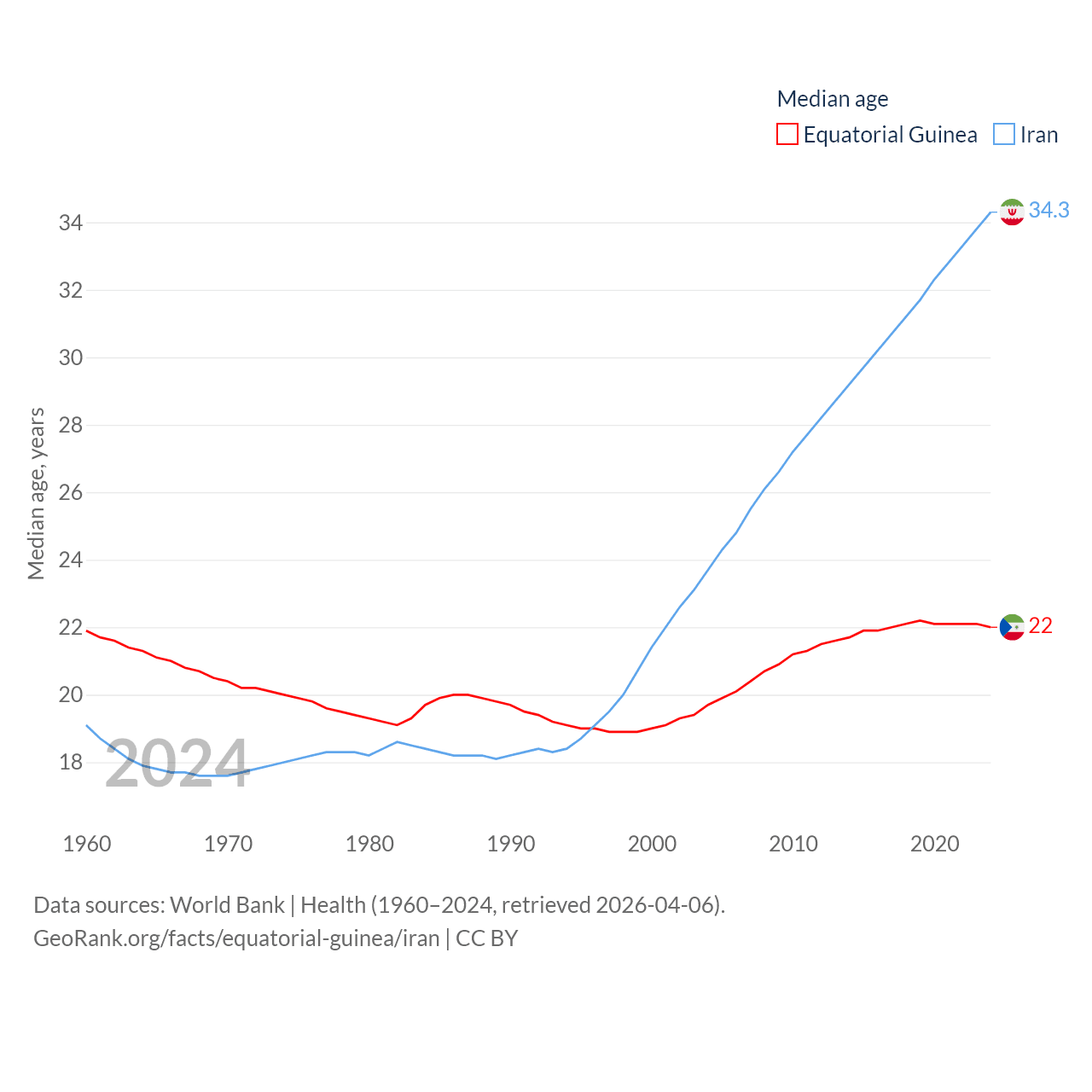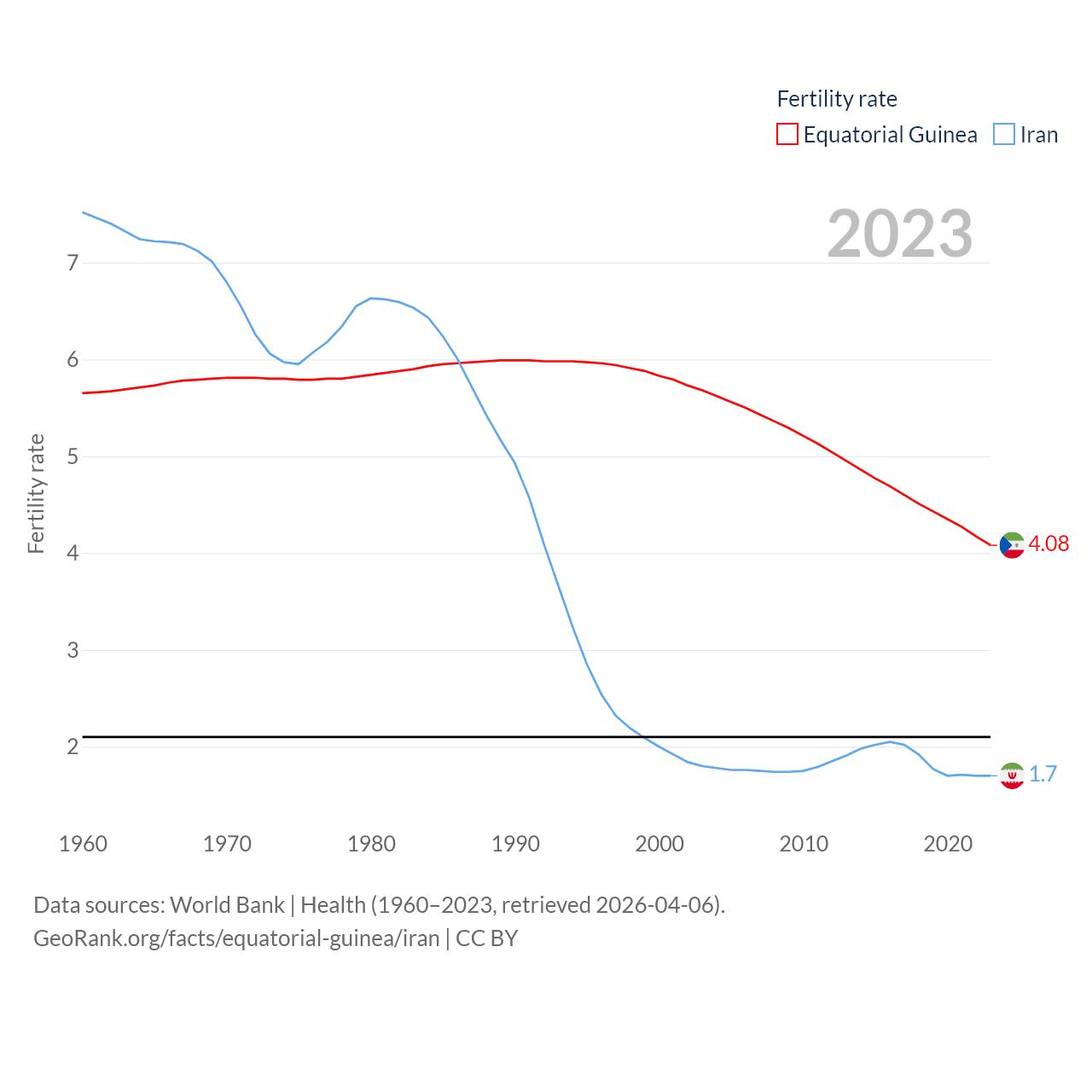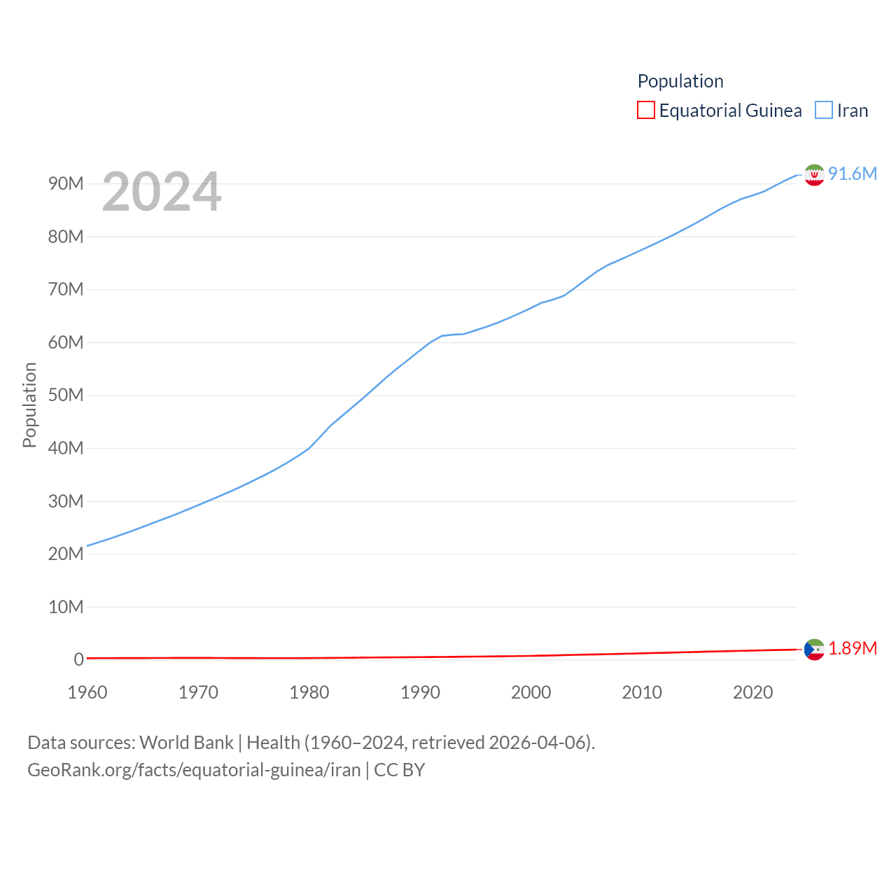 Equatorial Guinea has a population of 1.89M (ranked 148/197), compared with 91.6M in Iran (ranked 17/197). Equatorial Guinea's land area is 10,830 sq mi versus 626,451 sq mi for Iran (ranked 140th vs. 17th).