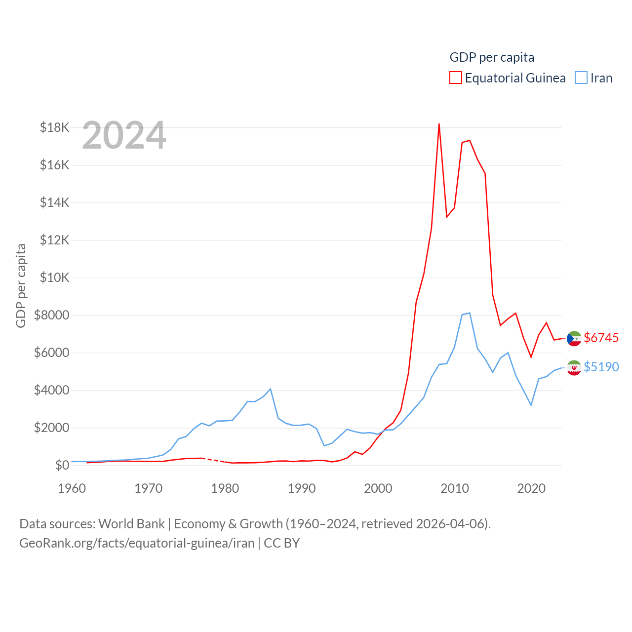 By GDP, Equatorial Guinea ranks 148/197 ($12.8B) and Iran ranks 34/197 ($475B). By GDP per capita, Equatorial Guinea ranks 106/197 ($6,745), while Iran ranks 119/197 ($5,190).