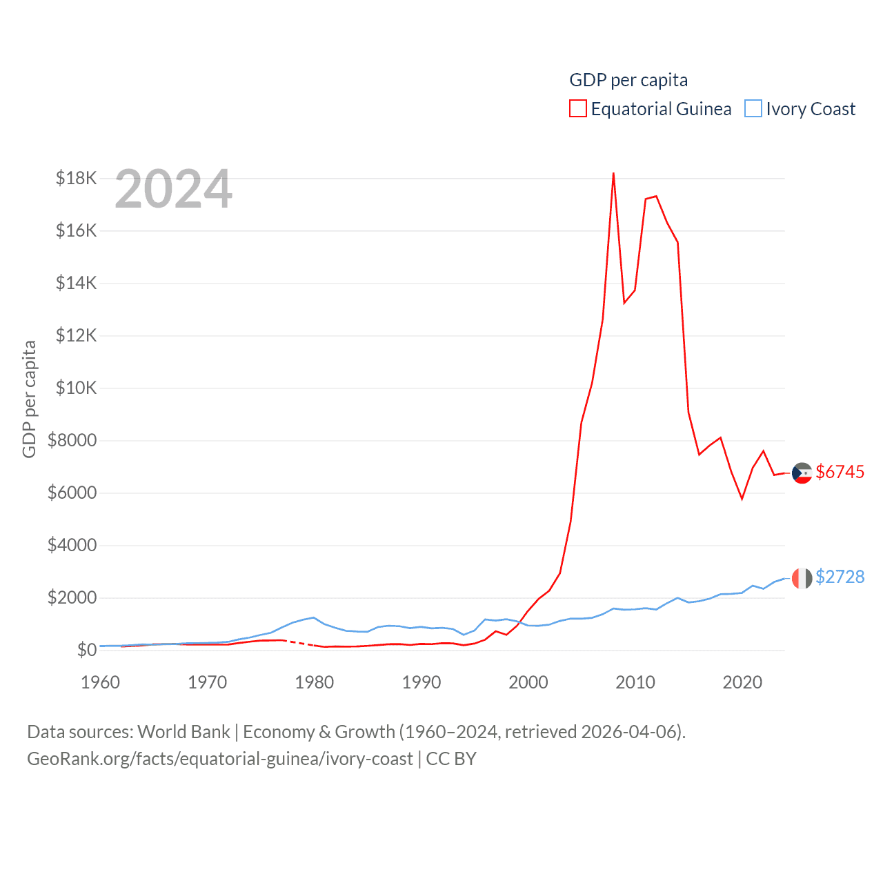 By GDP, Equatorial Guinea ranks 148/197 ($12.8B) and Ivory Coast ranks 77/197 ($87.1B). By GDP per capita, Equatorial Guinea ranks 106/197 ($6,745), while Ivory Coast ranks 142/197 ($2,728).