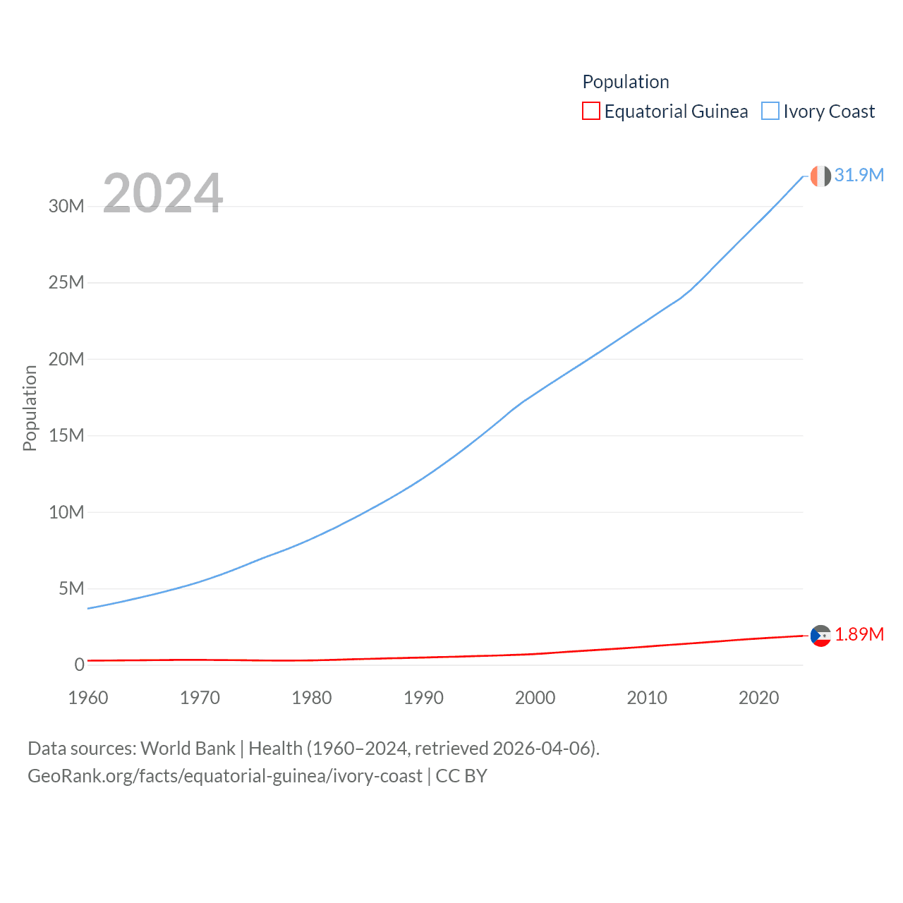 Equatorial Guinea has a population of 1.89M (ranked 148/197), compared with 31.9M in Ivory Coast (ranked 50/197). Equatorial Guinea's land area is 10,830 sq mi versus 122,780 sq mi for Ivory Coast (ranked 140th vs. 66th).