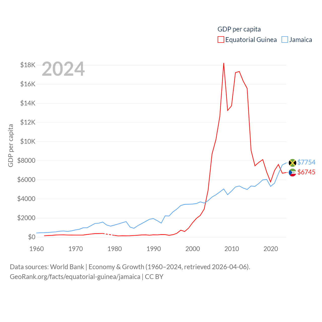 By GDP, Equatorial Guinea ranks 148/197 ($12.8B) and Jamaica ranks 124/197 ($22B). By GDP per capita, Equatorial Guinea ranks 106/197 ($6,745), while Jamaica ranks 95/197 ($7,754).