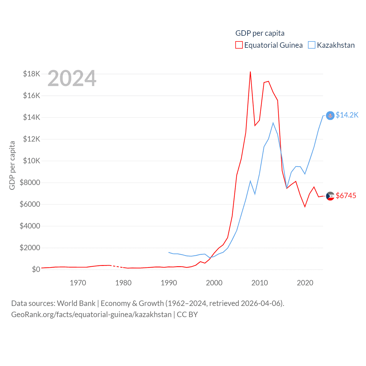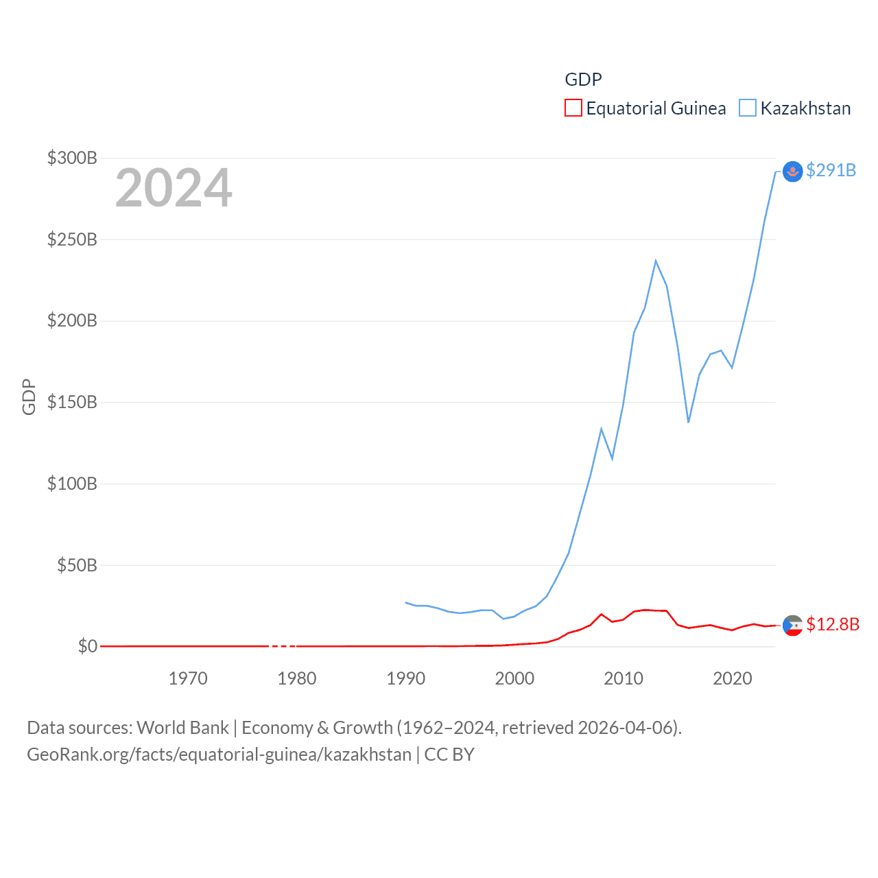 By GDP, Equatorial Guinea ranks 148/197 ($12.8B) and Kazakhstan ranks 48/197 ($291B). By GDP per capita, Equatorial Guinea ranks 106/197 ($6,745), while Kazakhstan ranks 71/197 ($14,155).