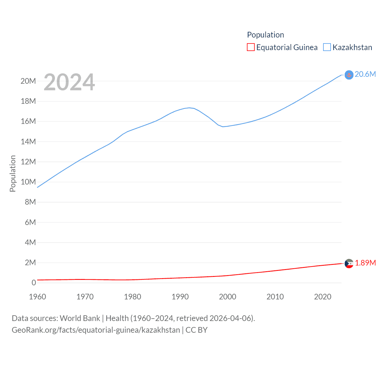 Equatorial Guinea has a population of 1.89M (ranked 148/197), compared with 20.6M in Kazakhstan (ranked 64/197). Equatorial Guinea's land area is 10,830 sq mi versus 1,042,360 sq mi for Kazakhstan (ranked 140th vs. 9th).