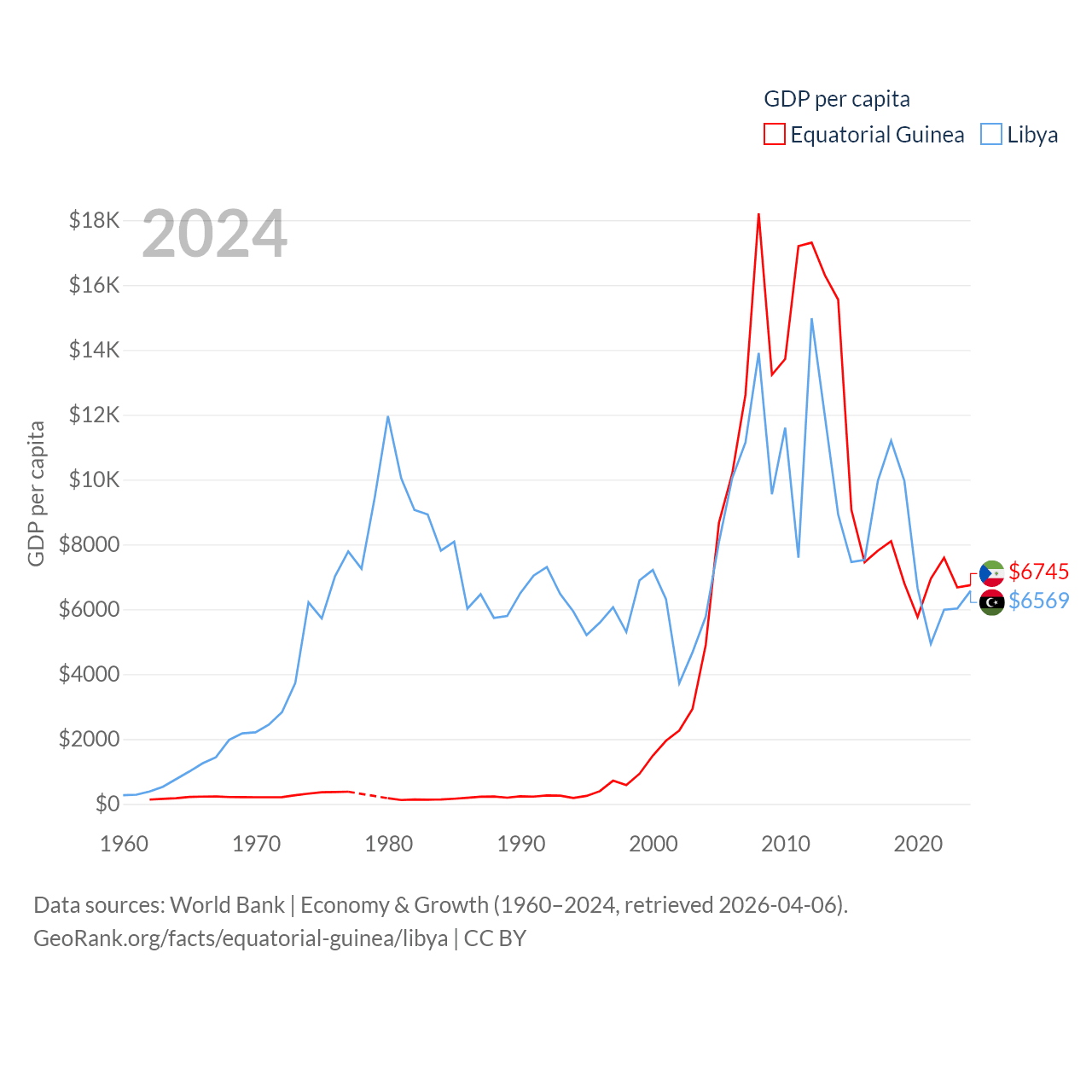 By GDP, Equatorial Guinea ranks 148/197 ($12.8B) and Libya ranks 95/197 ($48.5B). By GDP per capita, Equatorial Guinea ranks 106/197 ($6,745), while Libya ranks 107/197 ($6,569).