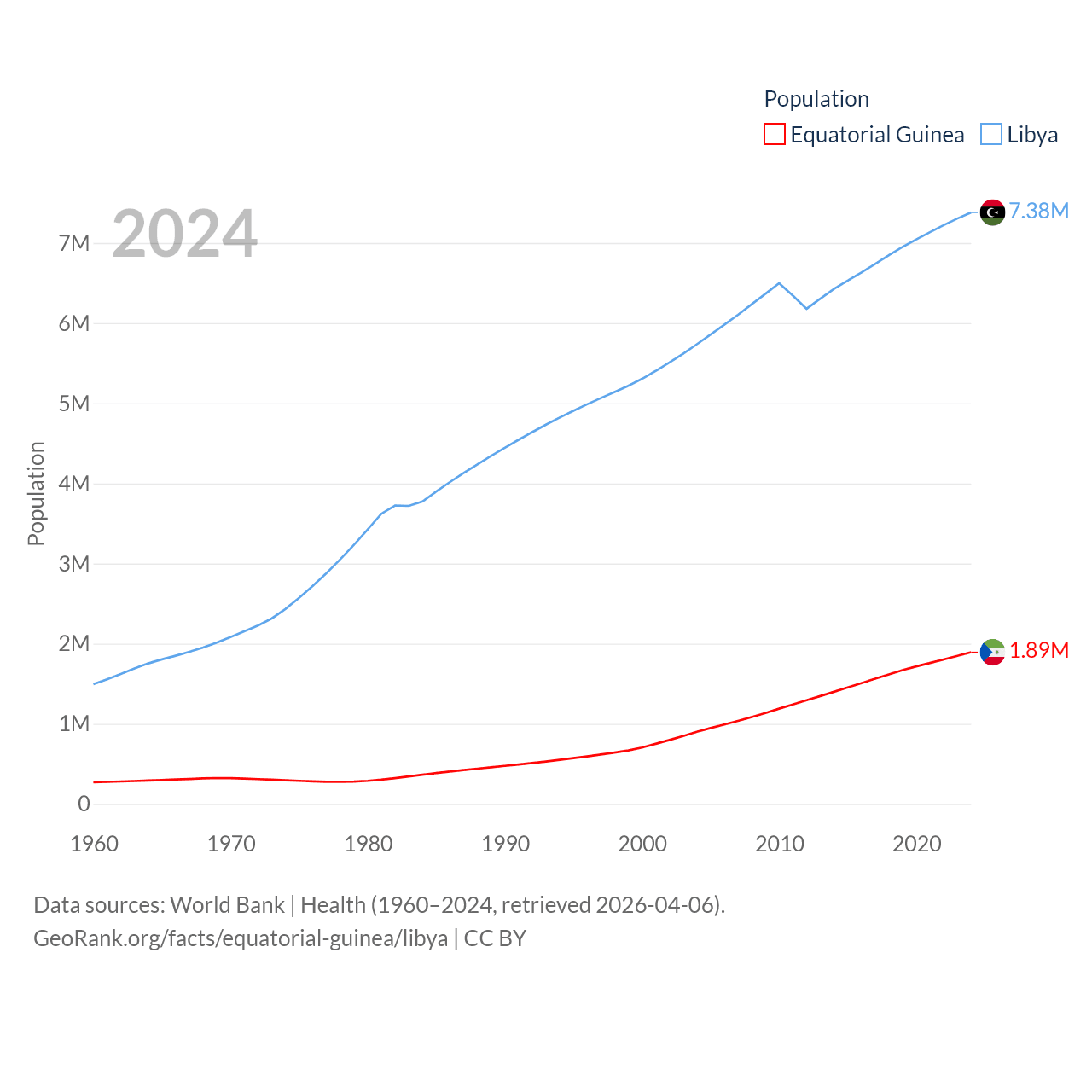 Equatorial Guinea has a population of 1.89M (ranked 148/197), compared with 7.38M in Libya (ranked 105/197). Equatorial Guinea's land area is 10,830 sq mi versus 679,362 sq mi for Libya (ranked 140th vs. 16th).