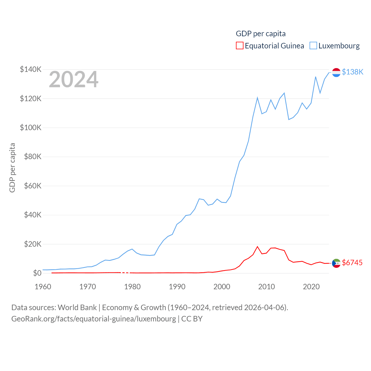 By GDP, Equatorial Guinea ranks 148/197 ($12.8B) and Luxembourg ranks 74/197 ($93.3B). By GDP per capita, Equatorial Guinea ranks 106/197 ($6,745), while Luxembourg ranks 3/197 ($137,782).