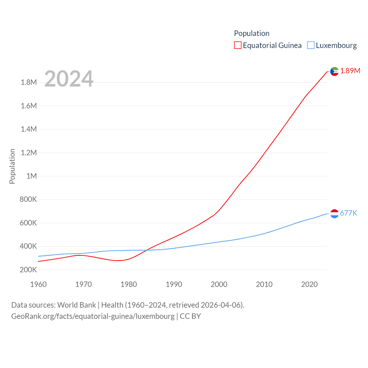 Equatorial Guinea has a population of 1.89M (ranked 148/197), compared with 677K in Luxembourg (ranked 164/197). Equatorial Guinea's land area is 10,830 sq mi versus 994 sq mi for Luxembourg (ranked 140th vs. 169th).