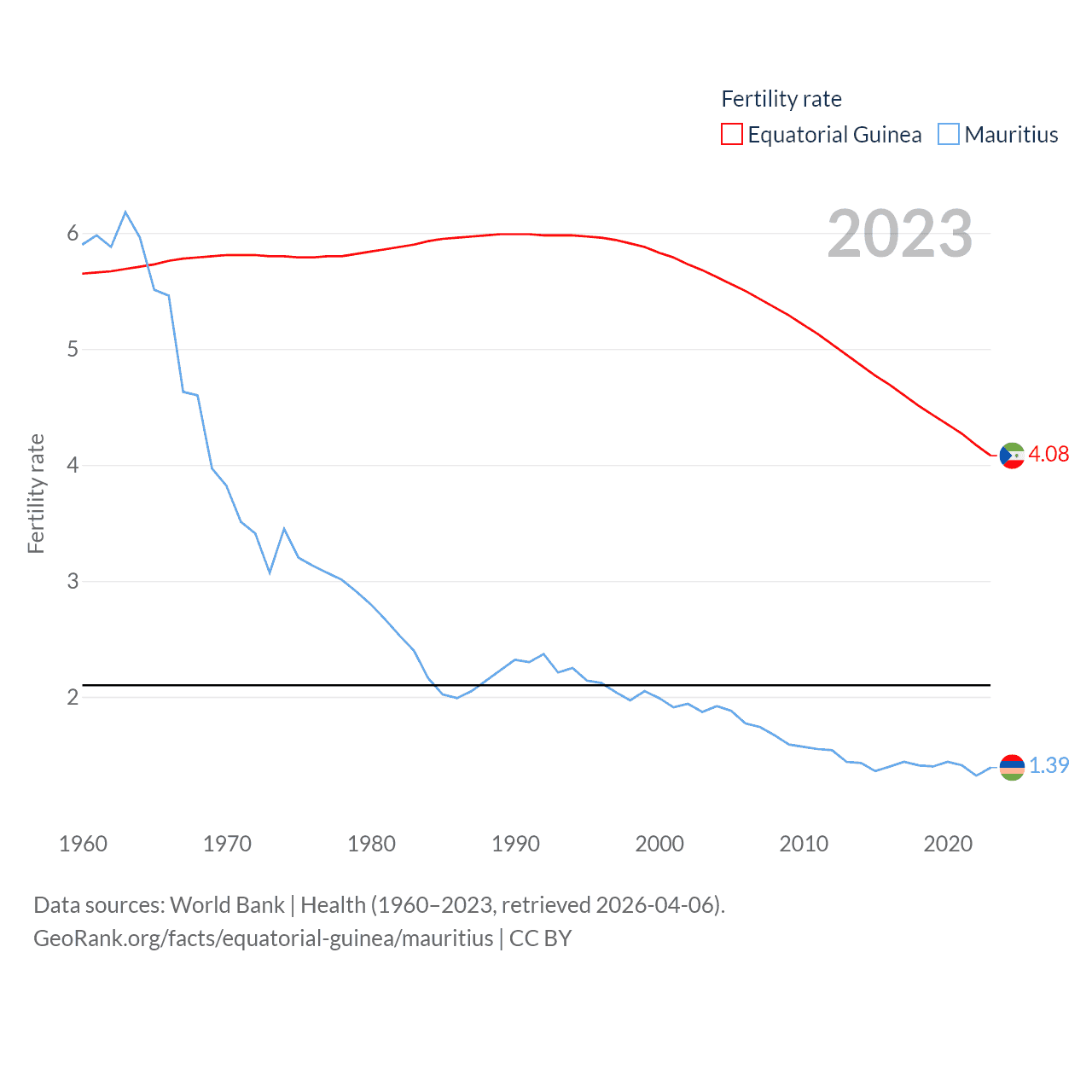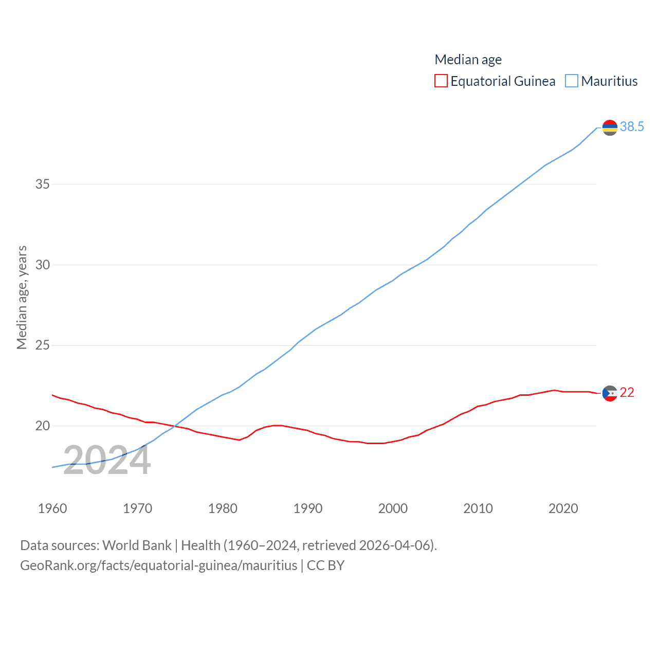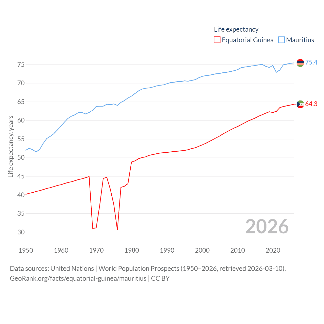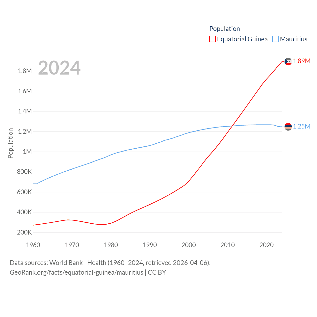 Equatorial Guinea has a population of 1.89M (ranked 148/197), compared with 1.25M in Mauritius (ranked 156/197). Equatorial Guinea's land area is 10,830 sq mi versus 771 sq mi for Mauritius (ranked 140th vs. 170th).