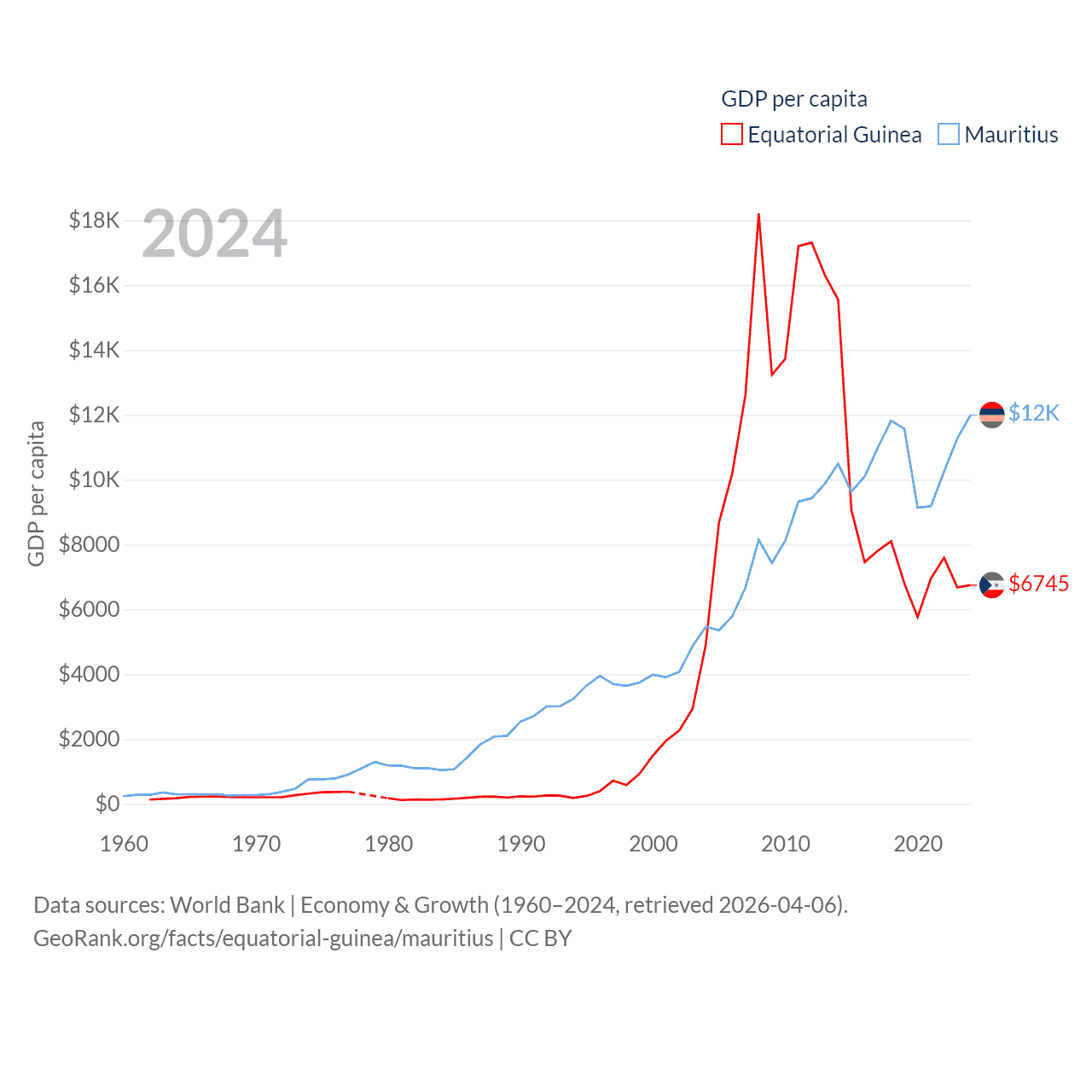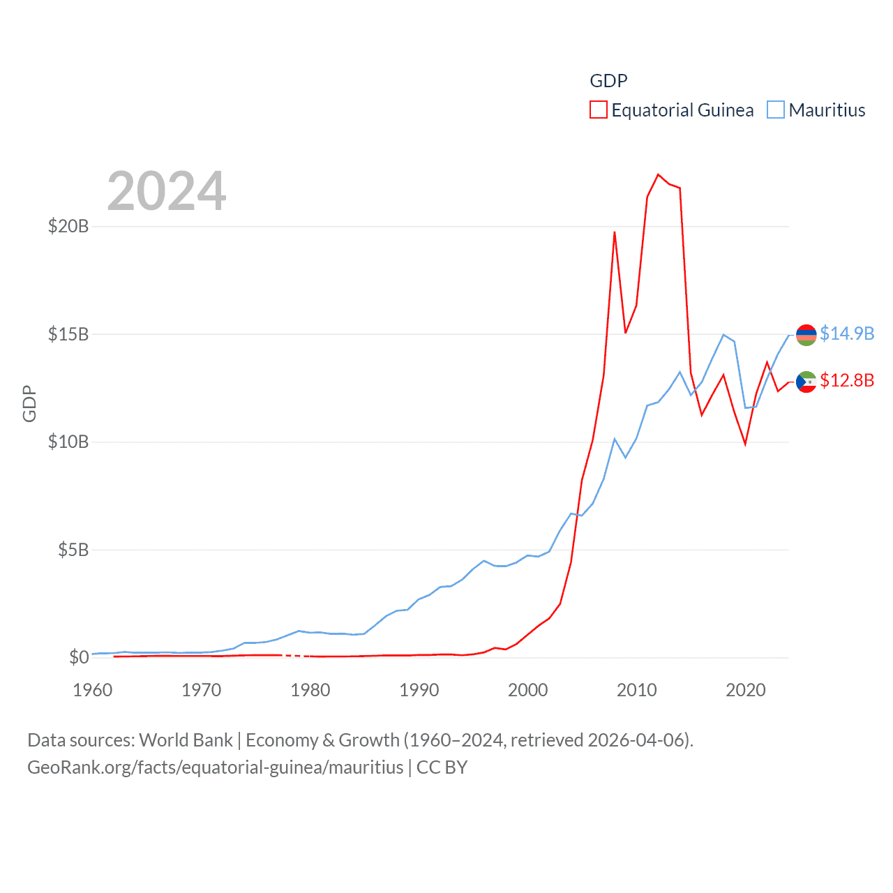 By GDP, Equatorial Guinea ranks 148/197 ($12.8B) and Mauritius ranks 143/197 ($14.9B). By GDP per capita, Equatorial Guinea ranks 106/197 ($6,745), while Mauritius ranks 78/197 ($11,991).