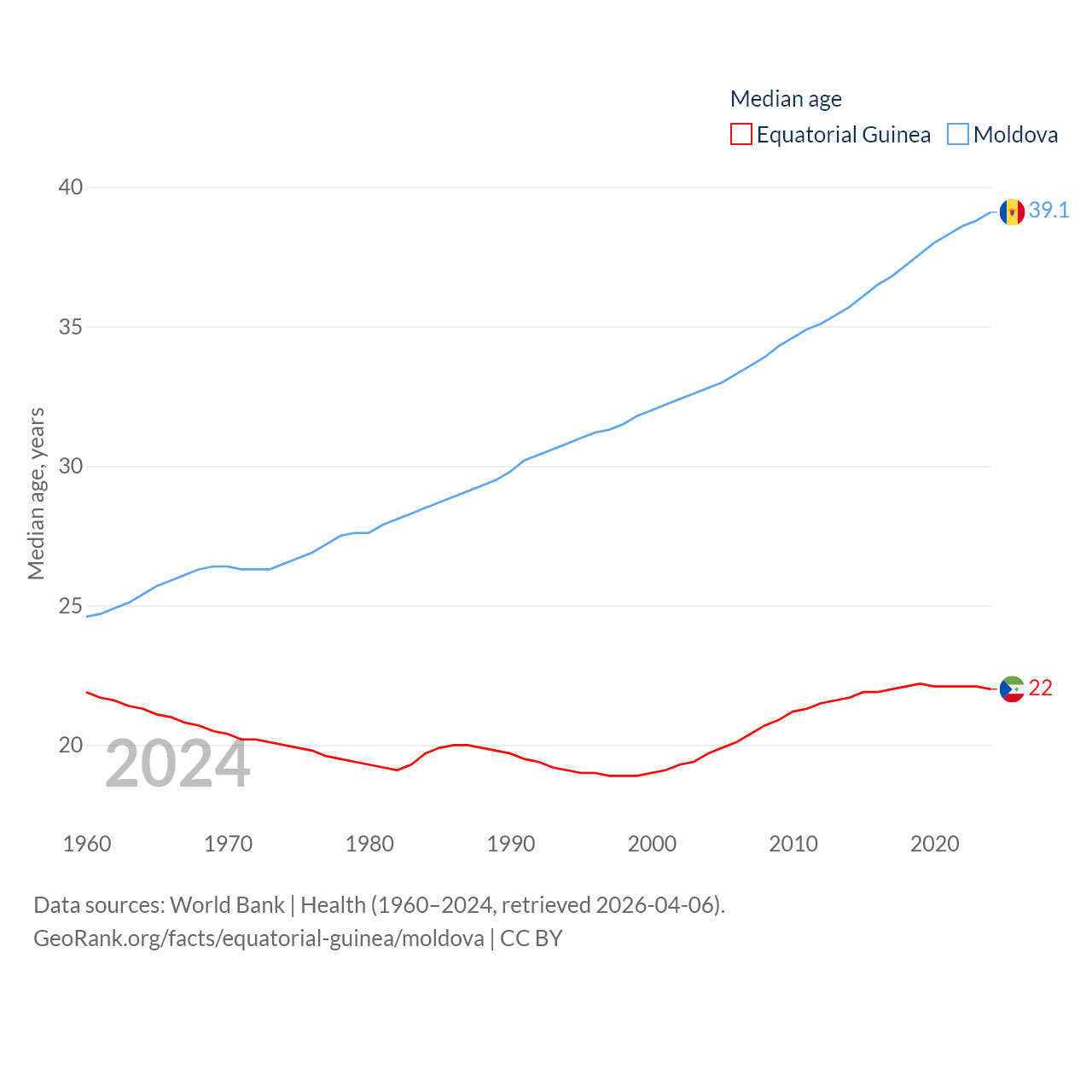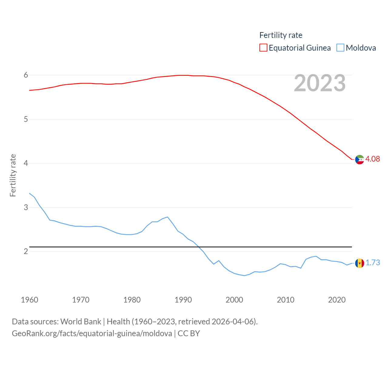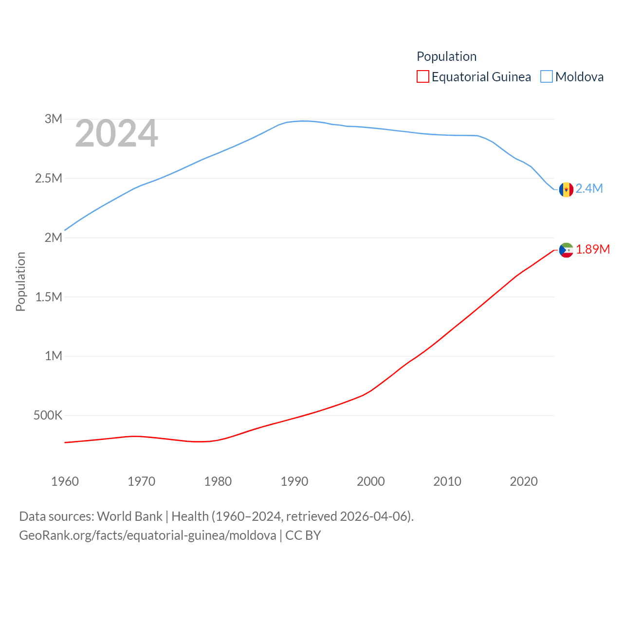 Equatorial Guinea has a population of 1.89M (ranked 148/197), compared with 2.4M in Moldova (ranked 143/197). Equatorial Guinea's land area is 10,830 sq mi versus 12,714 sq mi for Moldova (ranked 140th vs. 135th).