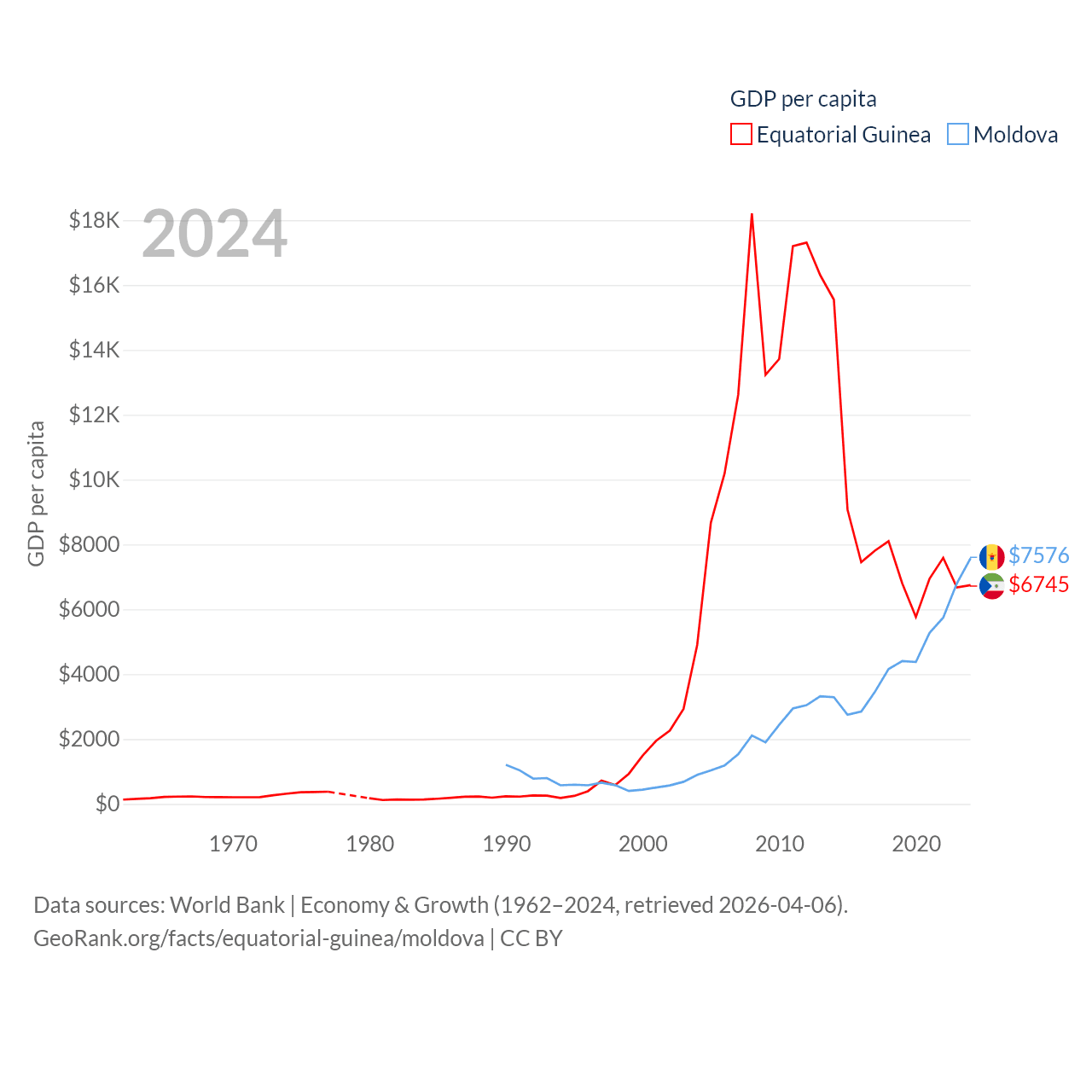 By GDP, Equatorial Guinea ranks 148/197 ($12.8B) and Moldova ranks 134/197 ($18.2B). By GDP per capita, Equatorial Guinea ranks 106/197 ($6,745), while Moldova ranks 99/197 ($7,576).