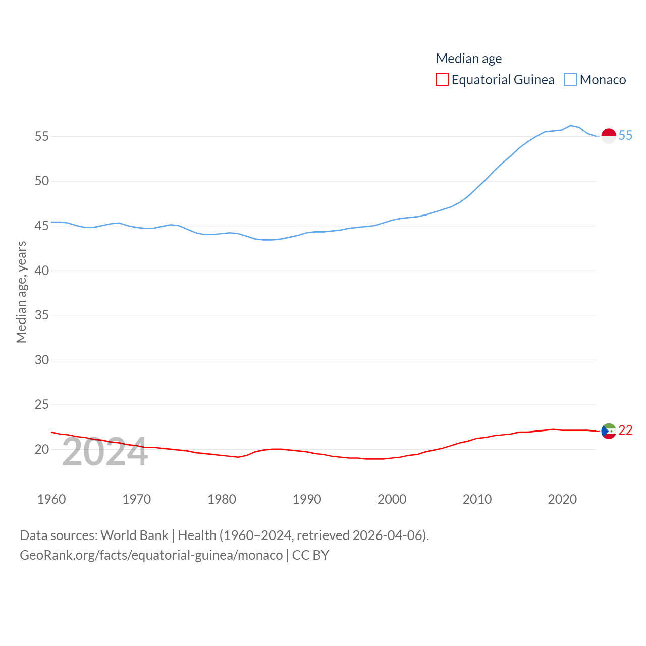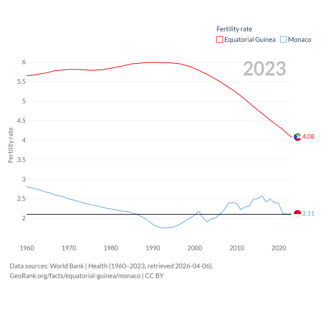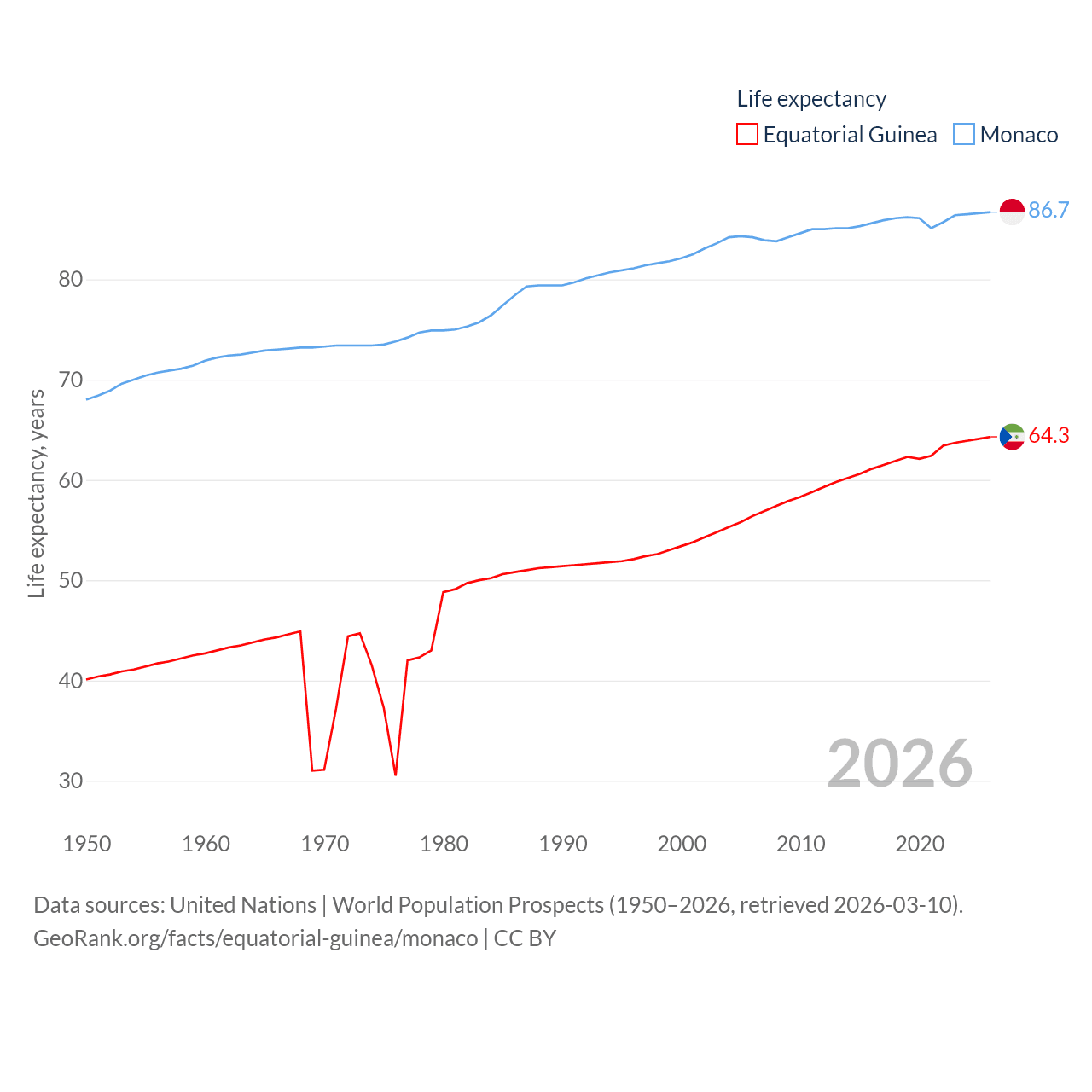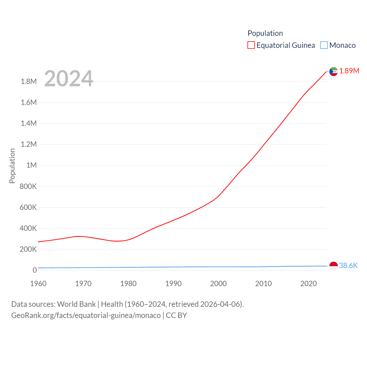 Equatorial Guinea has a population of 1.89M (ranked 148/197), compared with 38.6K in Monaco (ranked 191/197). Equatorial Guinea's land area is 10,830 sq mi versus 0.8 sq mi for Monaco (ranked 140th vs. 196th).