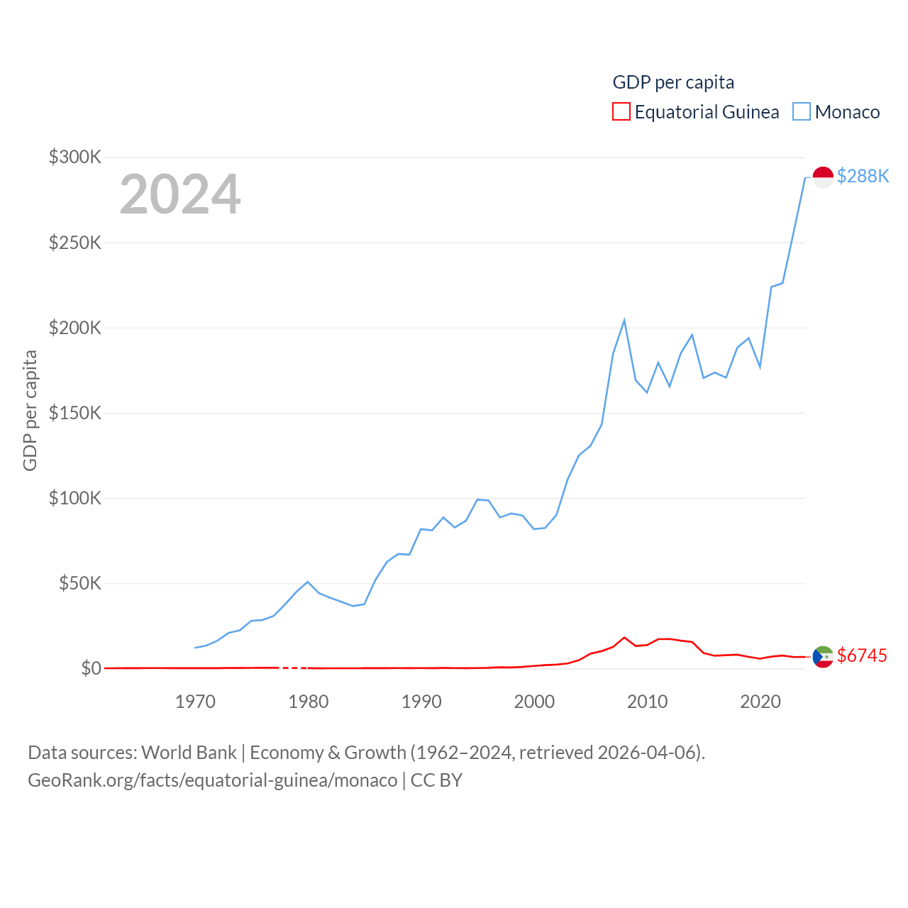 By GDP, Equatorial Guinea ranks 148/197 ($12.8B) and Monaco ranks 152/197 ($11.1B). By GDP per capita, Equatorial Guinea ranks 106/197 ($6,745), while Monaco ranks 1/197 ($288,001).