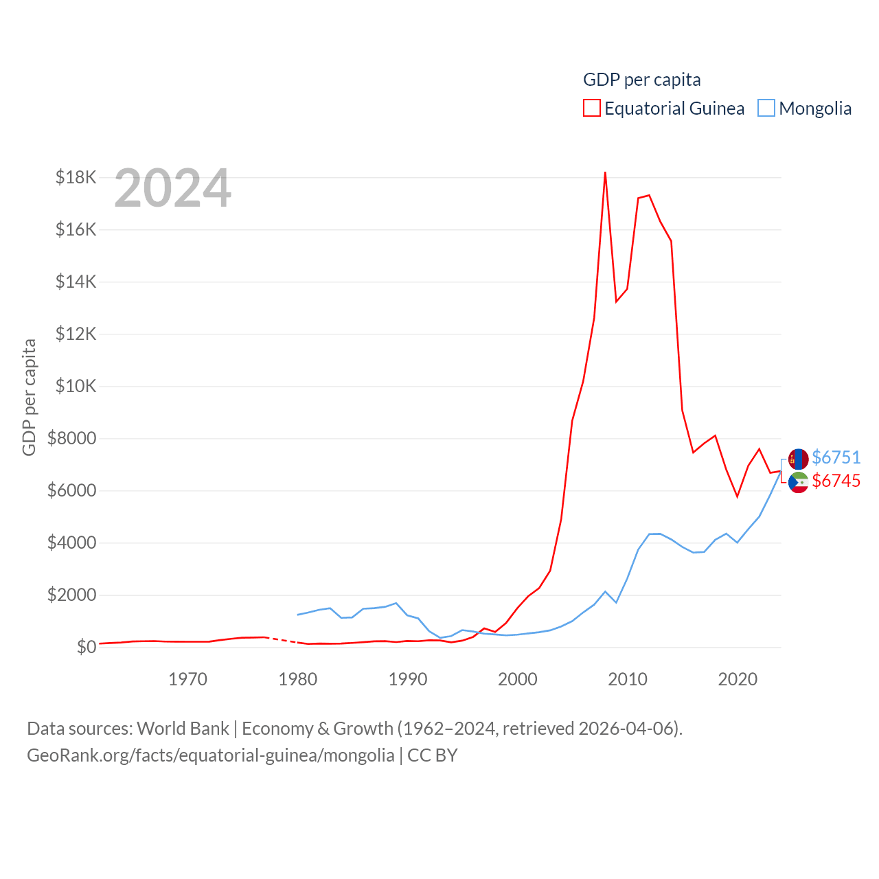 By GDP, Equatorial Guinea ranks 148/197 ($12.8B) and Mongolia ranks 121/197 ($23.8B). By GDP per capita, Equatorial Guinea ranks 106/197 ($6,745), while Mongolia ranks 105/197 ($6,751).