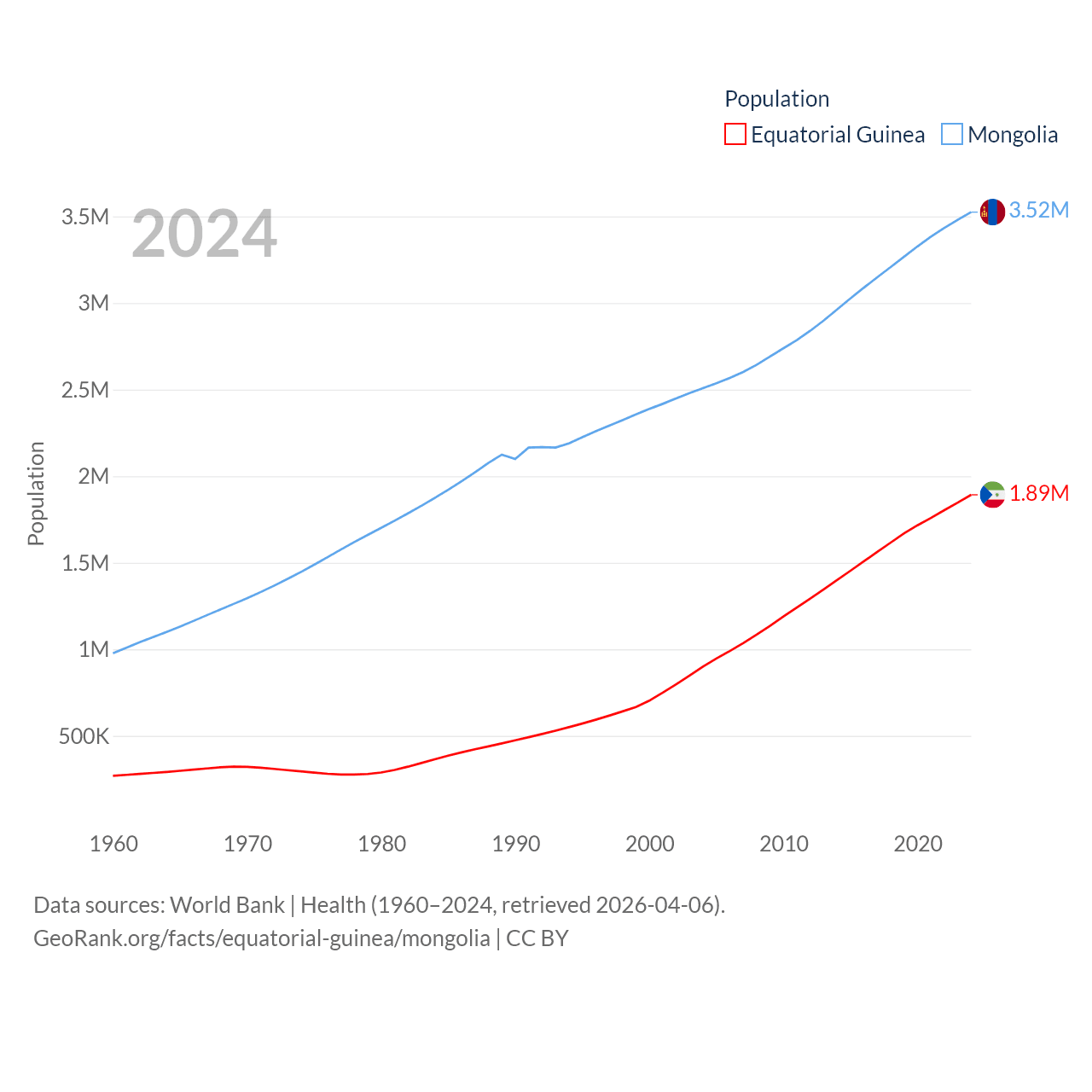 Equatorial Guinea has a population of 1.89M (ranked 148/197), compared with 3.52M in Mongolia (ranked 132/197). Equatorial Guinea's land area is 10,830 sq mi versus 601,740 sq mi for Mongolia (ranked 140th vs. 18th).