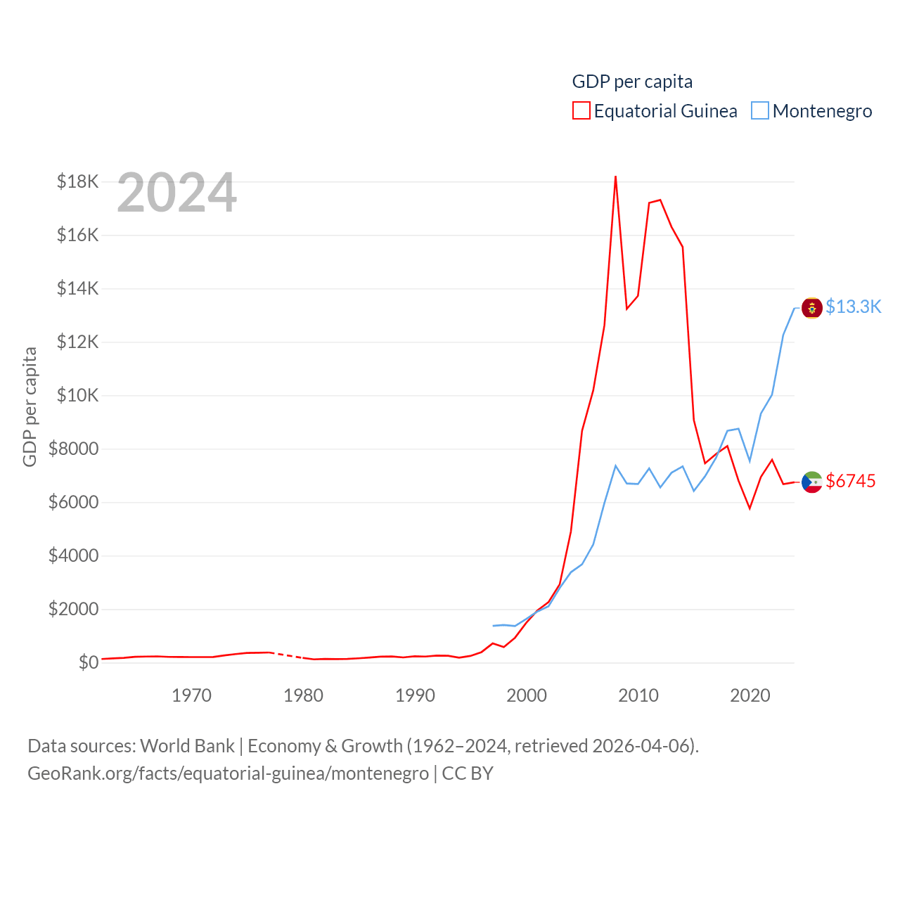 By GDP, Equatorial Guinea ranks 148/197 ($12.8B) and Montenegro ranks 155/197 ($8.27B). By GDP per capita, Equatorial Guinea ranks 106/197 ($6,745), while Montenegro ranks 77/197 ($13,263).