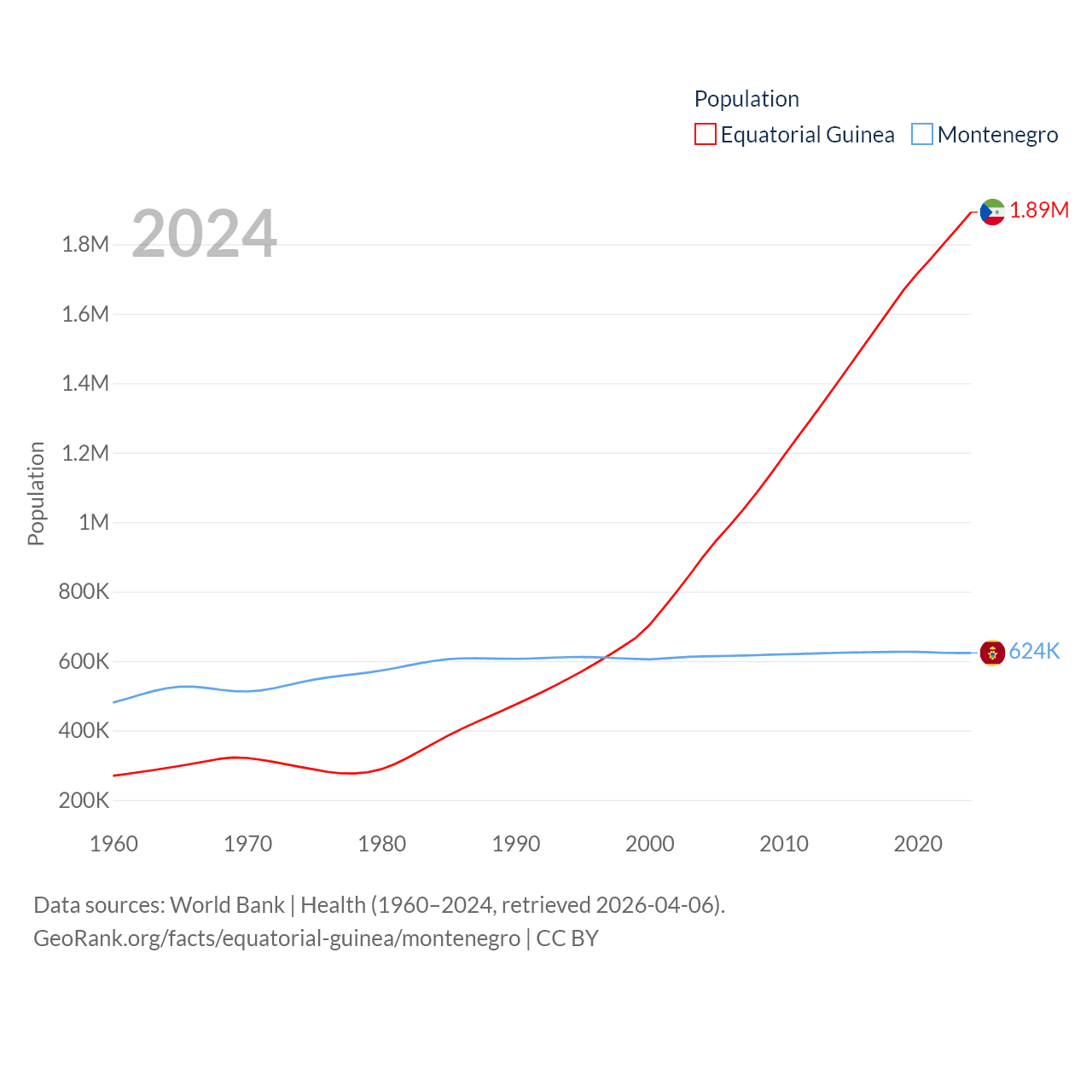 Equatorial Guinea has a population of 1.89M (ranked 148/197), compared with 624K in Montenegro (ranked 166/197). Equatorial Guinea's land area is 10,830 sq mi versus 5,193 sq mi for Montenegro (ranked 140th vs. 156th).