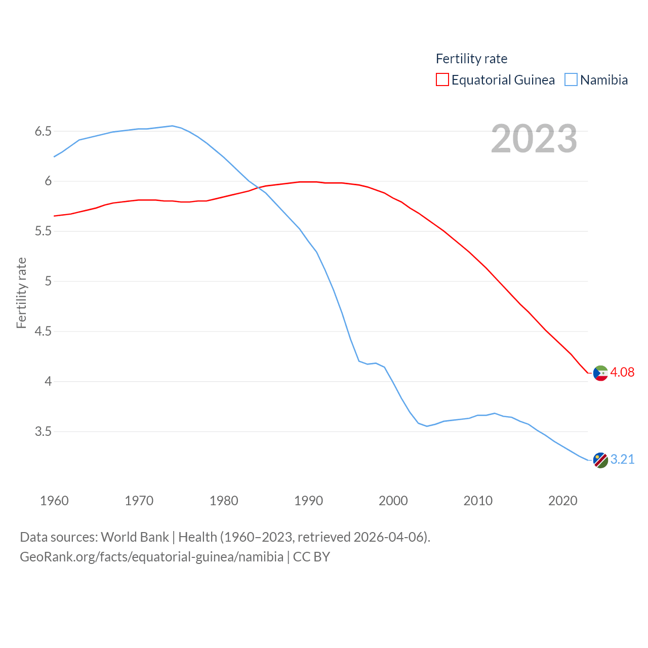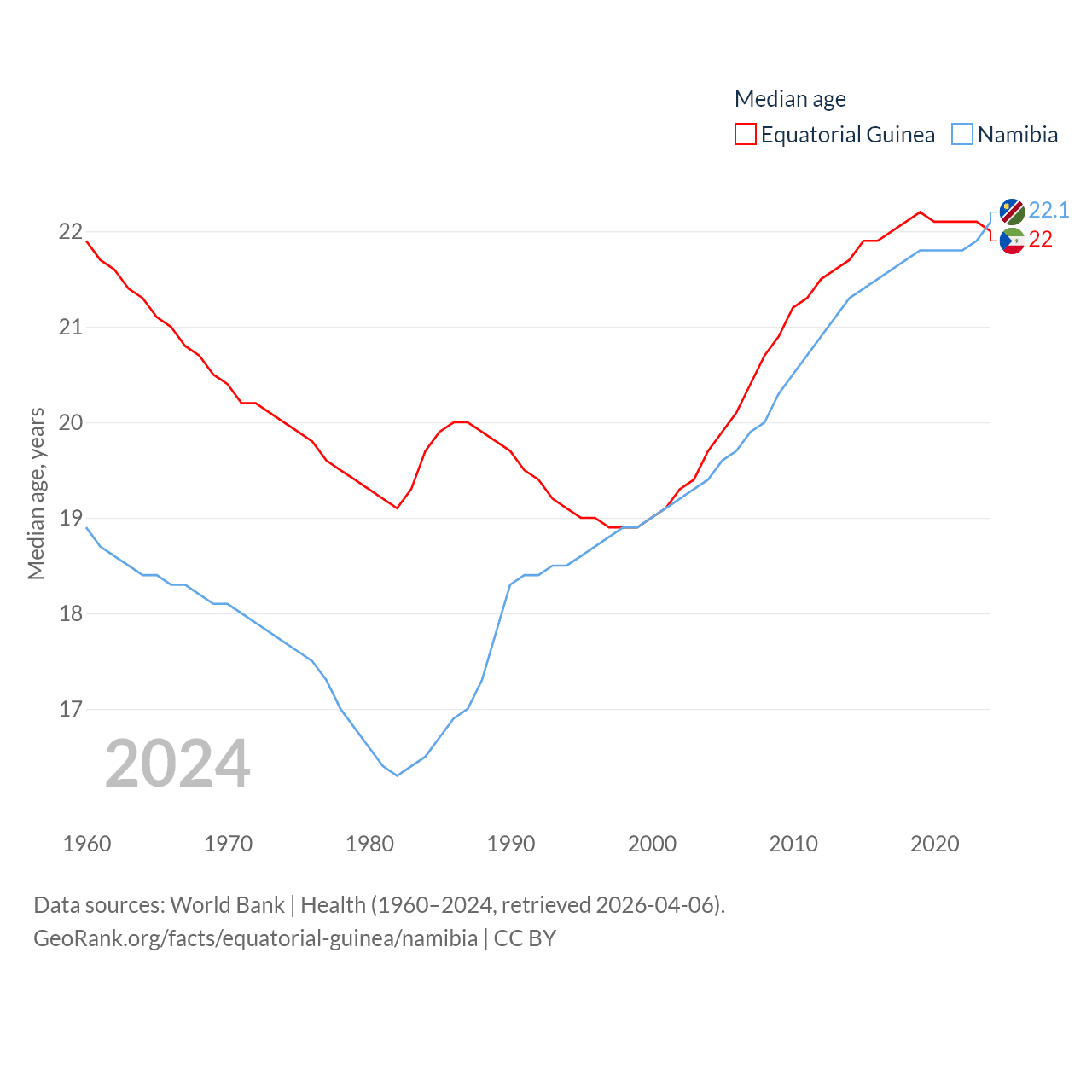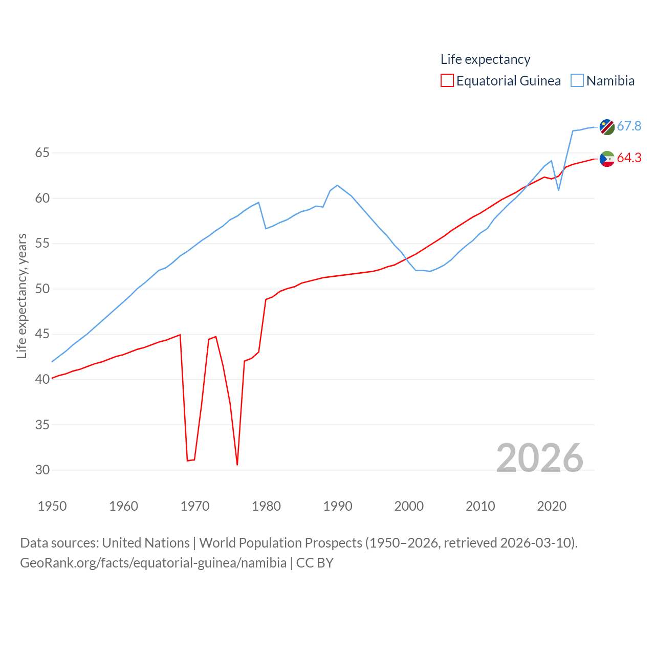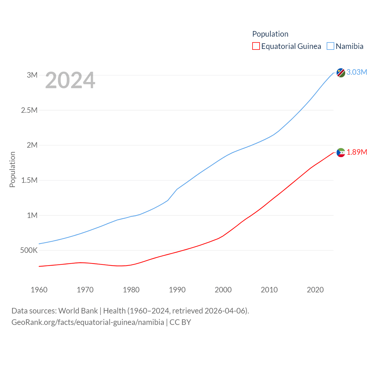 Equatorial Guinea has a population of 1.89M (ranked 148/197), compared with 3.03M in Namibia (ranked 136/197). Equatorial Guinea's land area is 10,830 sq mi versus 317,874 sq mi for Namibia (ranked 140th vs. 33rd).