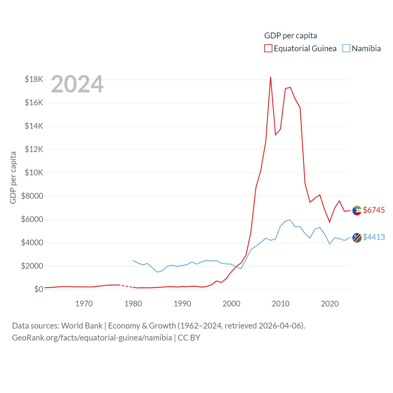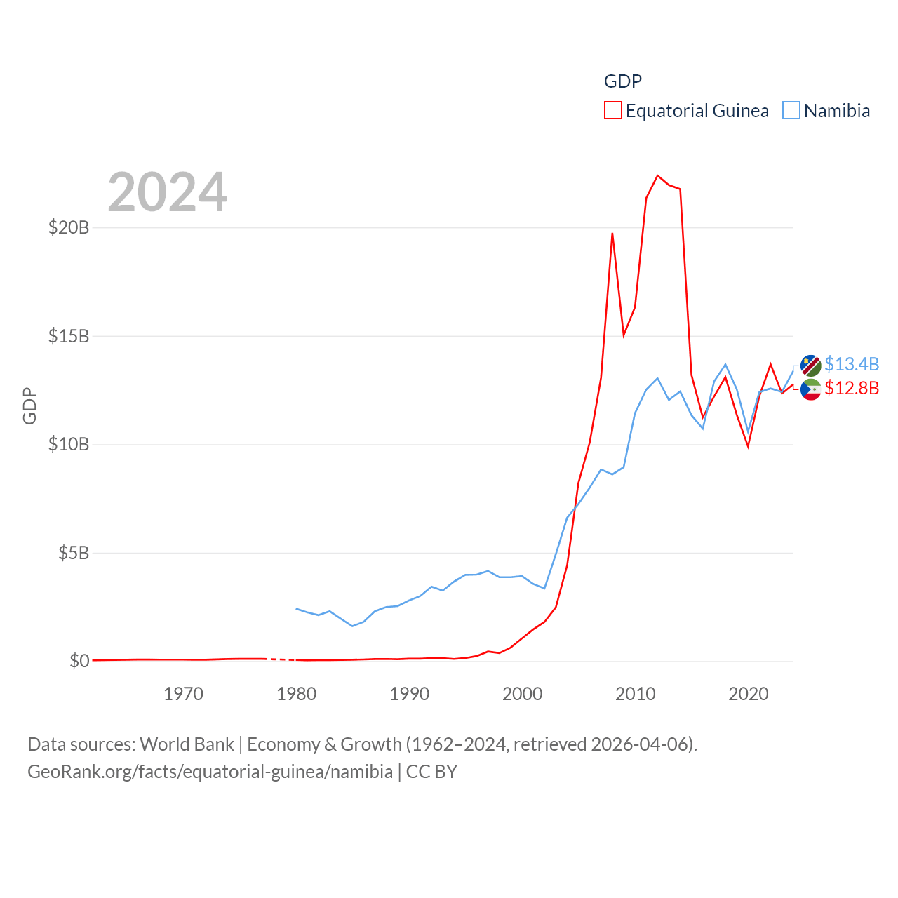 By GDP, Equatorial Guinea ranks 148/197 ($12.8B) and Namibia ranks 147/197 ($13.4B). By GDP per capita, Equatorial Guinea ranks 106/197 ($6,745), while Namibia ranks 126/197 ($4,413).
