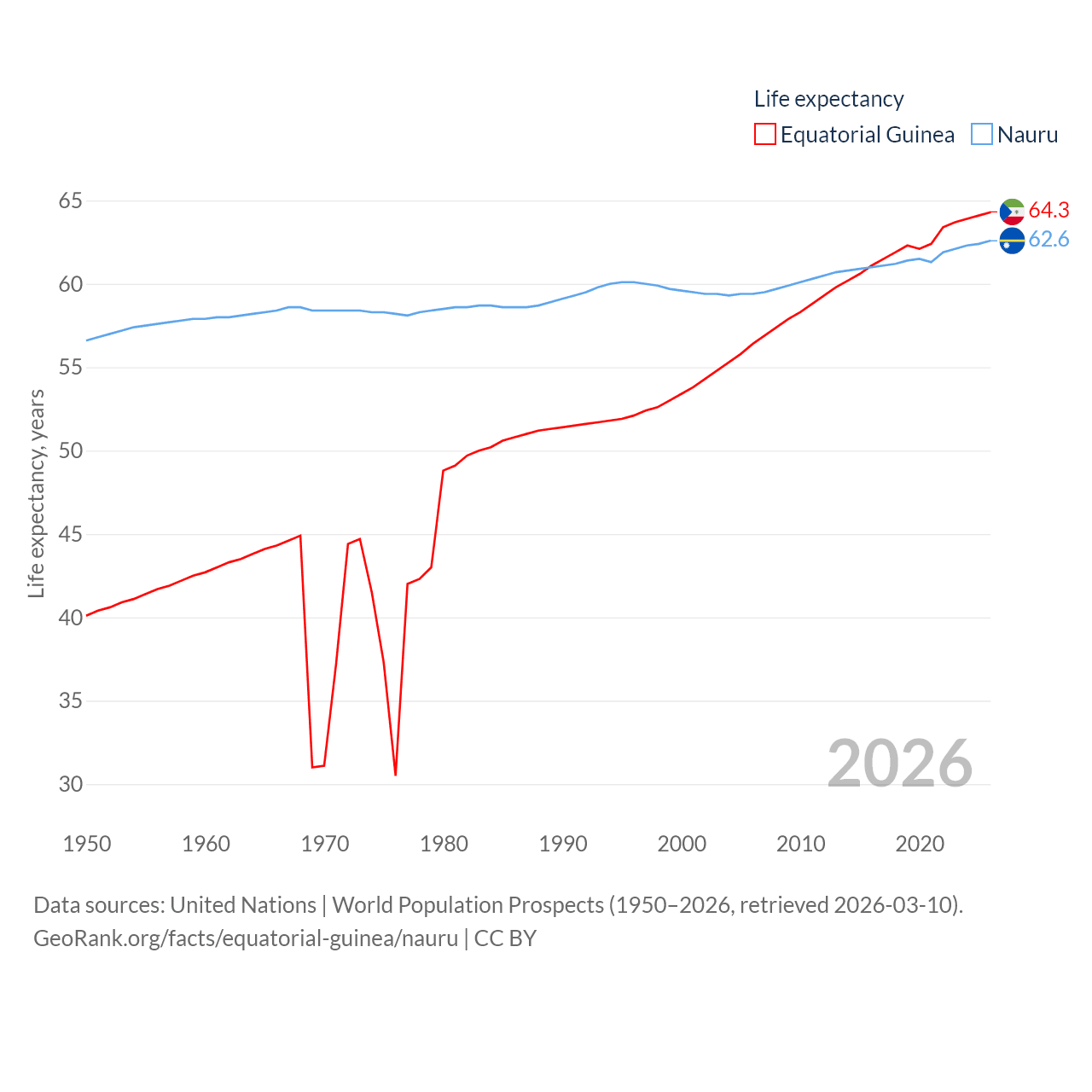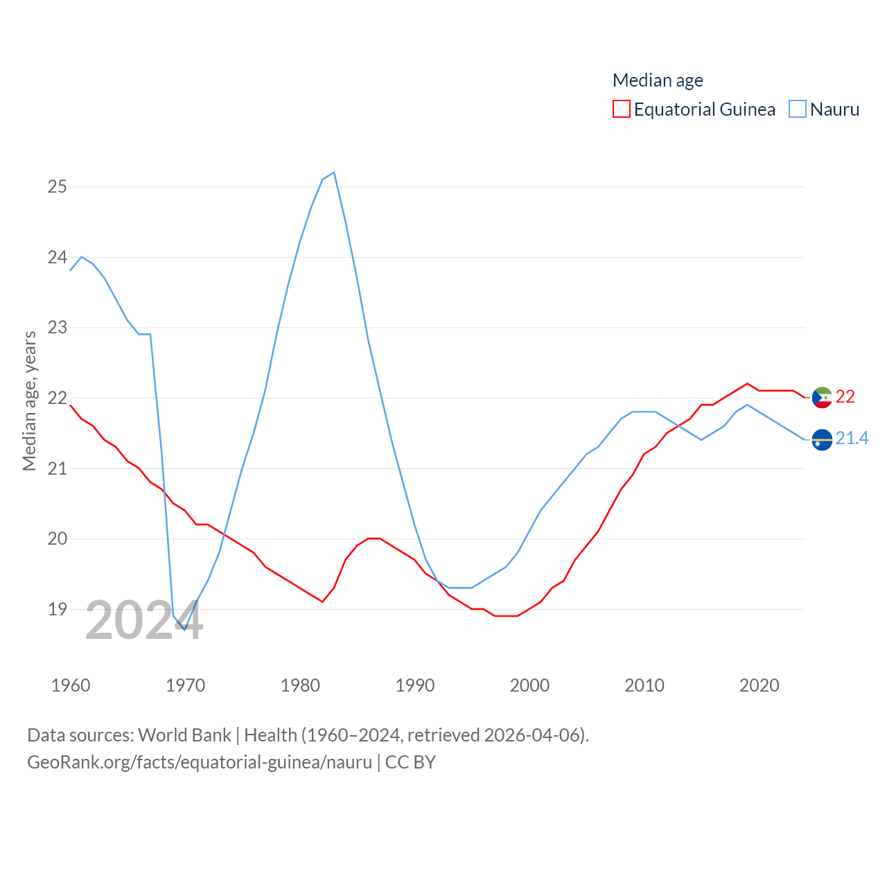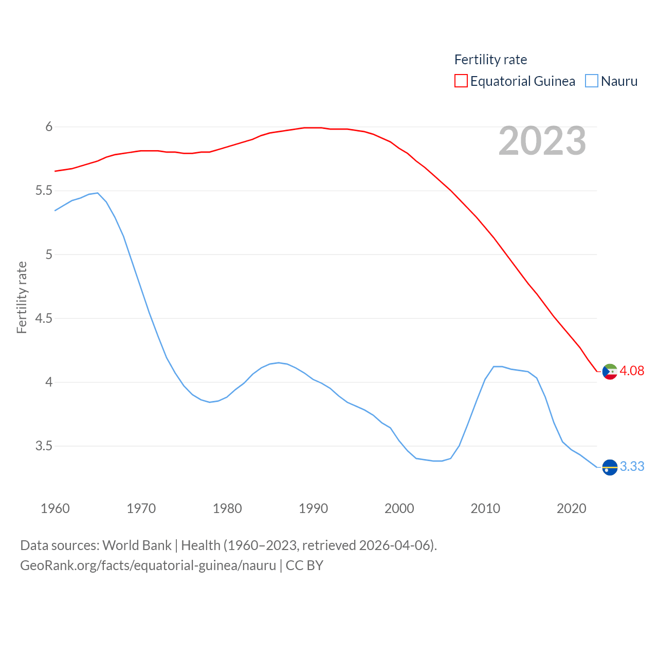 Equatorial Guinea has a population of 1.89M (ranked 148/197), compared with 11.9K in Nauru (ranked 195/197). Equatorial Guinea's land area is 10,830 sq mi versus 7.72 sq mi for Nauru (ranked 140th vs. 195th).