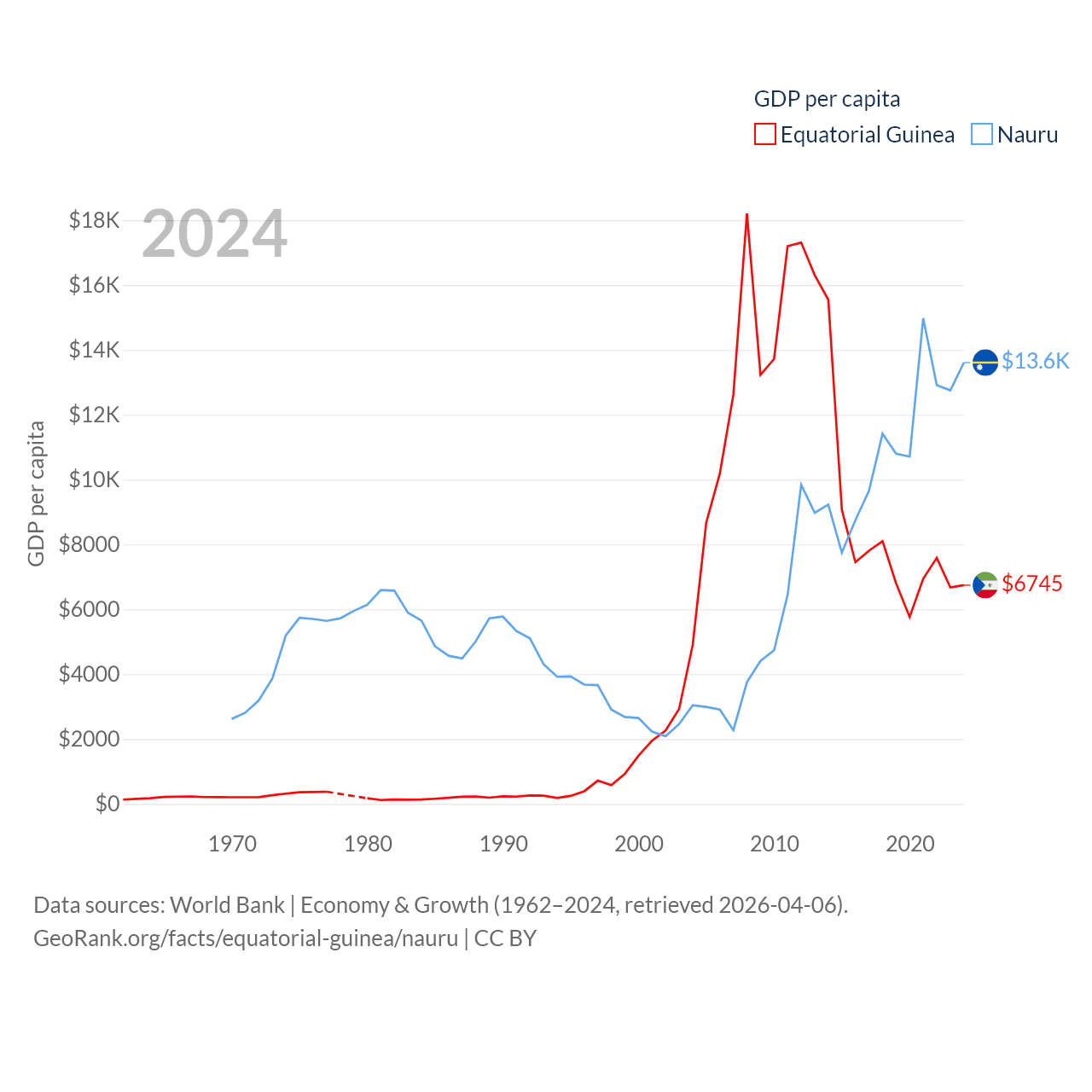 By GDP, Equatorial Guinea ranks 148/197 ($12.8B) and Nauru ranks 195/197 ($163M). By GDP per capita, Equatorial Guinea ranks 106/197 ($6,745), while Nauru ranks 74/197 ($13,609).