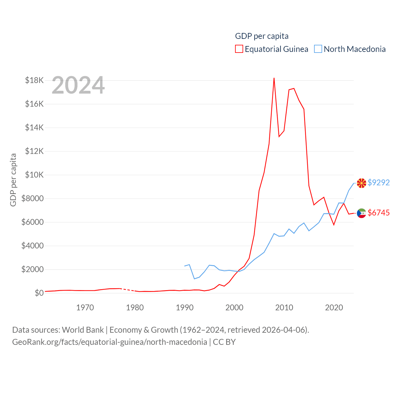By GDP, Equatorial Guinea ranks 148/197 ($12.8B) and North Macedonia ranks 138/197 ($17B). By GDP per capita, Equatorial Guinea ranks 106/197 ($6,745), while North Macedonia ranks 88/197 ($9,292).