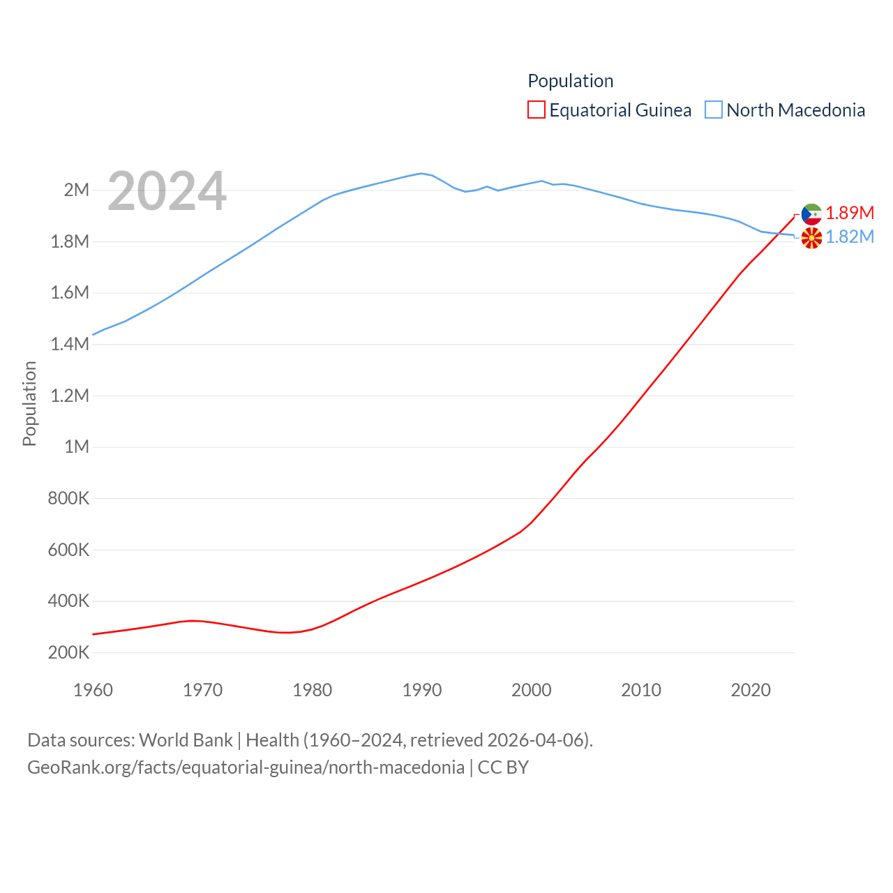 Equatorial Guinea has a population of 1.89M (ranked 148/197), compared with 1.82M in North Macedonia (ranked 150/197). Equatorial Guinea's land area is 10,830 sq mi versus 9,737 sq mi for North Macedonia (ranked 140th vs. 145th).