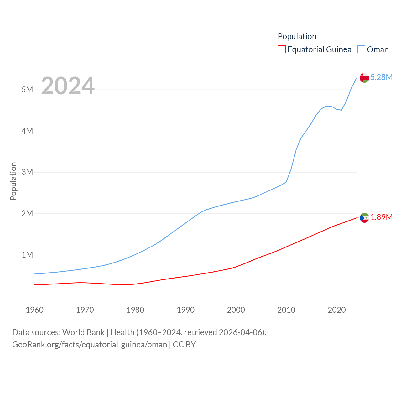 Equatorial Guinea has a population of 1.89M (ranked 148/197), compared with 5.28M in Oman (ranked 124/197). Equatorial Guinea's land area is 10,830 sq mi versus 119,499 sq mi for Oman (ranked 140th vs. 68th).
