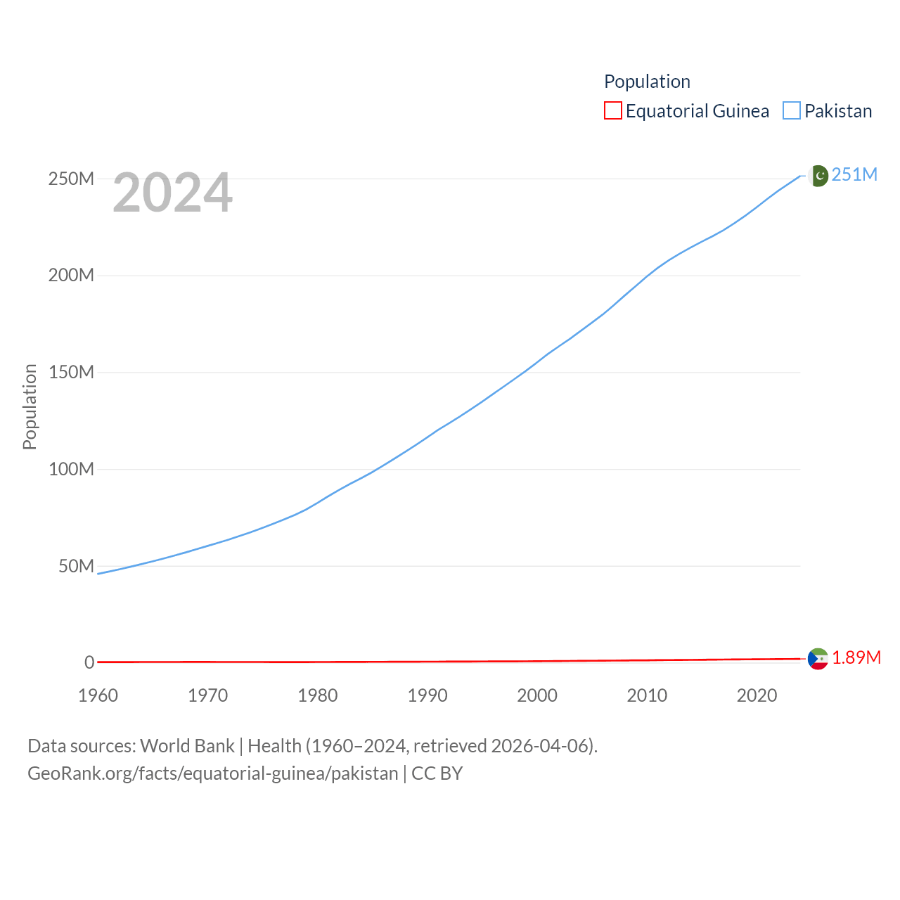 Equatorial Guinea has a population of 1.89M (ranked 148/197), compared with 251M in Pakistan (ranked 5/197). Equatorial Guinea's land area is 10,830 sq mi versus 297,638 sq mi for Pakistan (ranked 140th vs. 35th).
