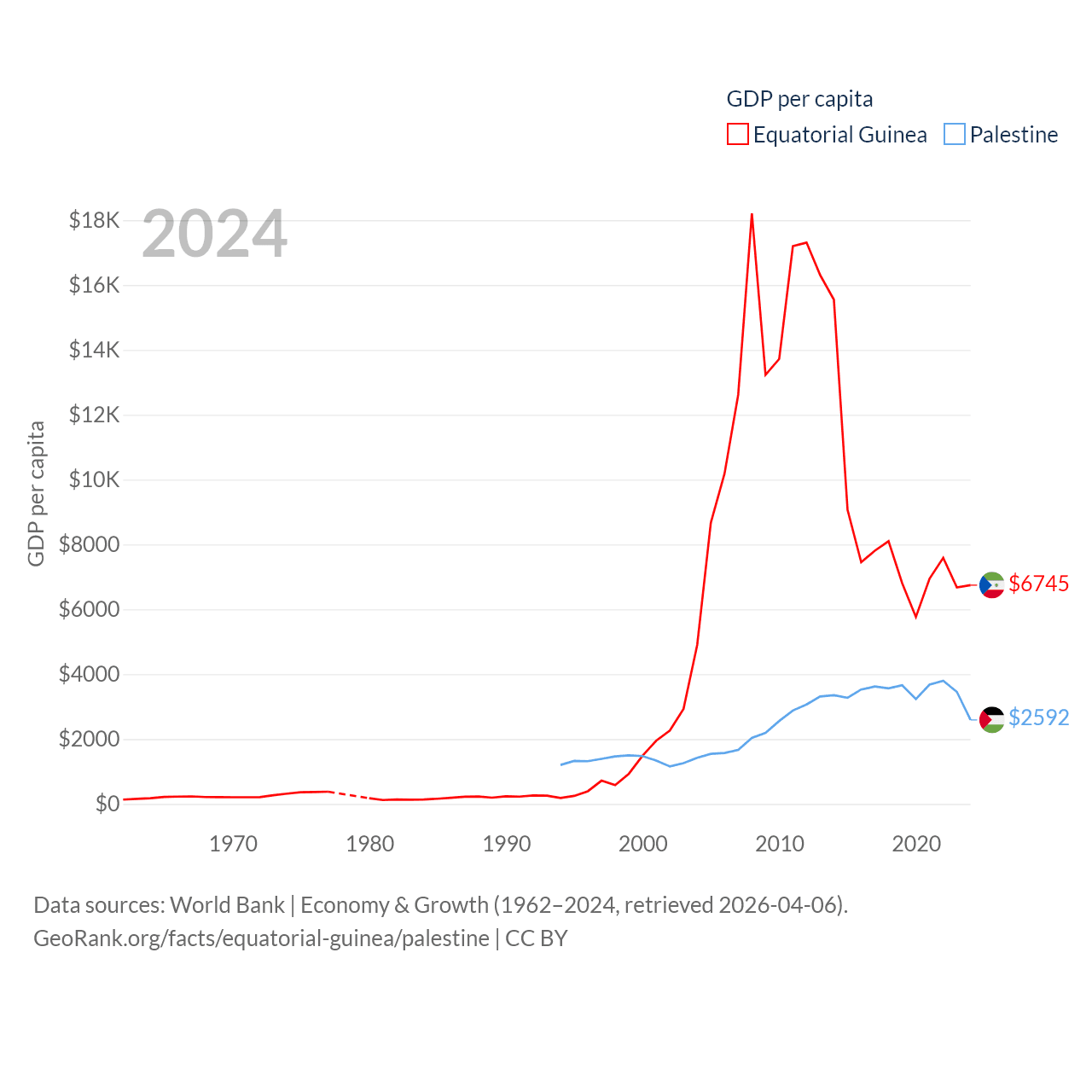 By GDP, Equatorial Guinea ranks 148/197 ($12.8B) and Palestine ranks 146/197 ($13.7B). By GDP per capita, Equatorial Guinea ranks 106/197 ($6,745), while Palestine ranks 147/197 ($2,592).
