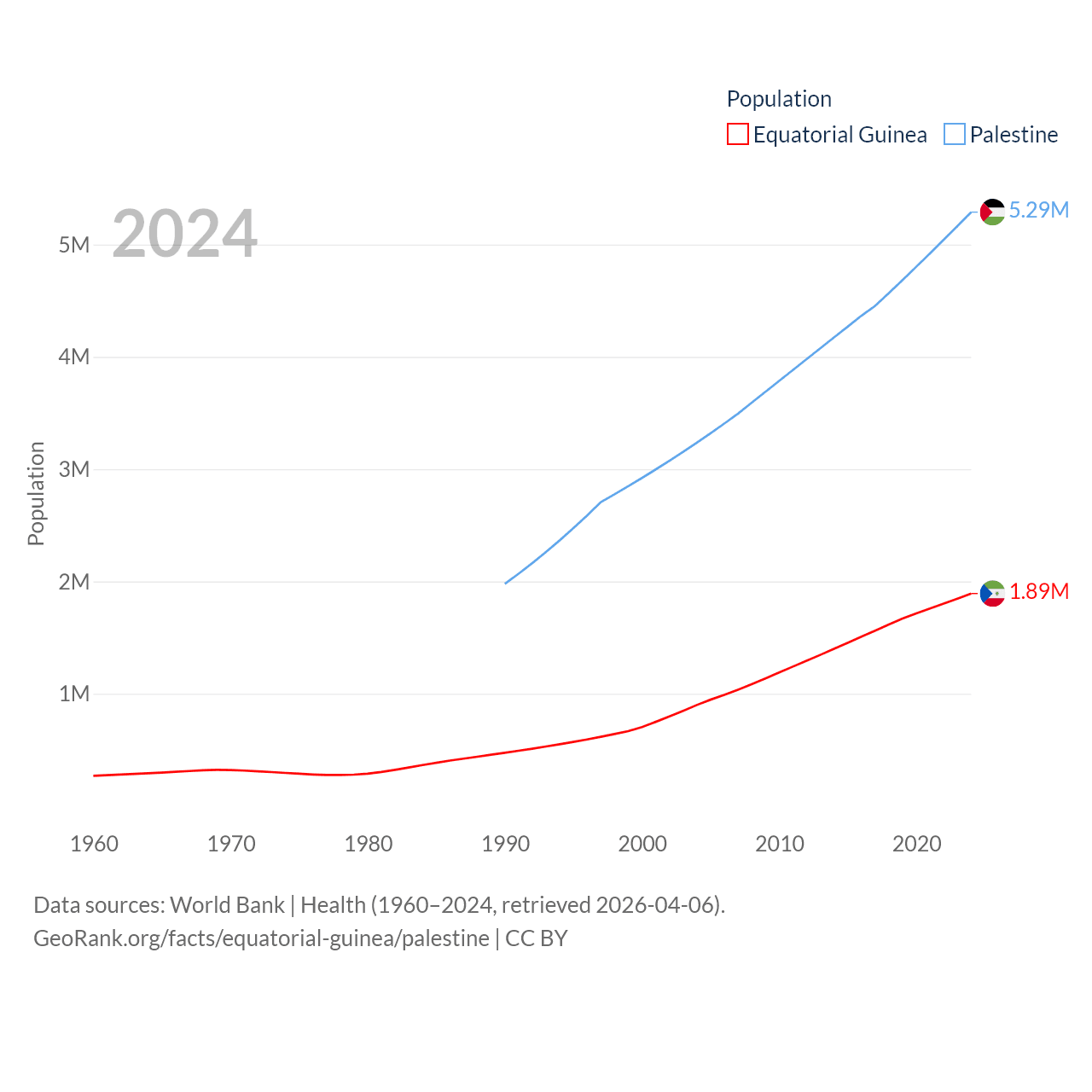 Equatorial Guinea has a population of 1.89M (ranked 148/197), compared with 5.29M in Palestine (ranked 122/197). Equatorial Guinea's land area is 10,830 sq mi versus 2,326 sq mi for Palestine (ranked 140th vs. 164th).