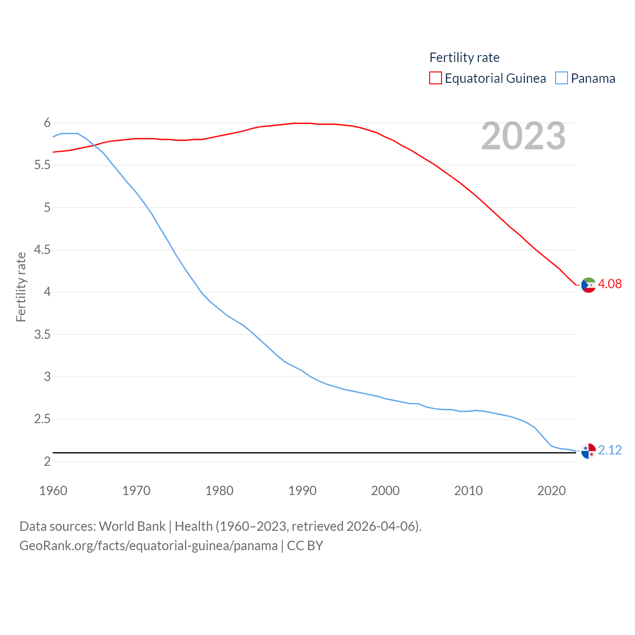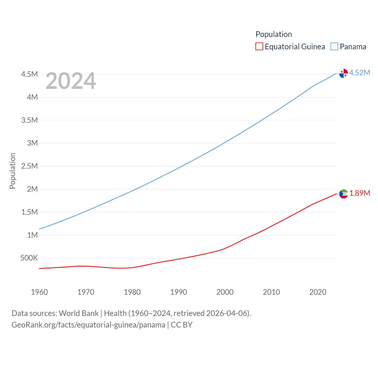 Equatorial Guinea has a population of 1.89M (ranked 148/197), compared with 4.52M in Panama (ranked 128/197). Equatorial Guinea's land area is 10,830 sq mi versus 28,641 sq mi for Panama (ranked 140th vs. 115th).