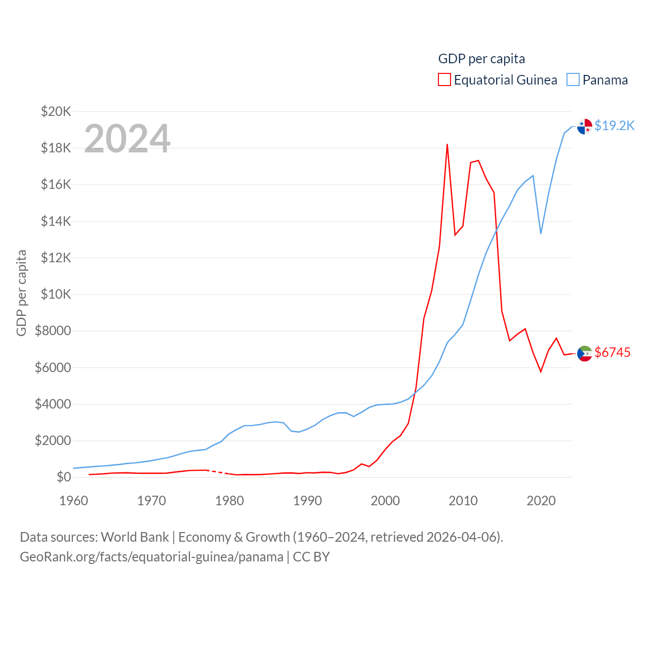 By GDP, Equatorial Guinea ranks 148/197 ($12.8B) and Panama ranks 78/197 ($86.5B). By GDP per capita, Equatorial Guinea ranks 106/197 ($6,745), while Panama ranks 60/197 ($19,161).