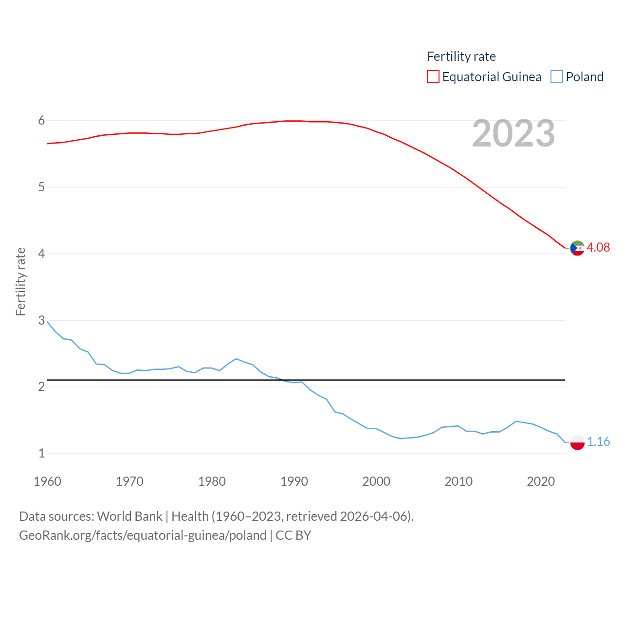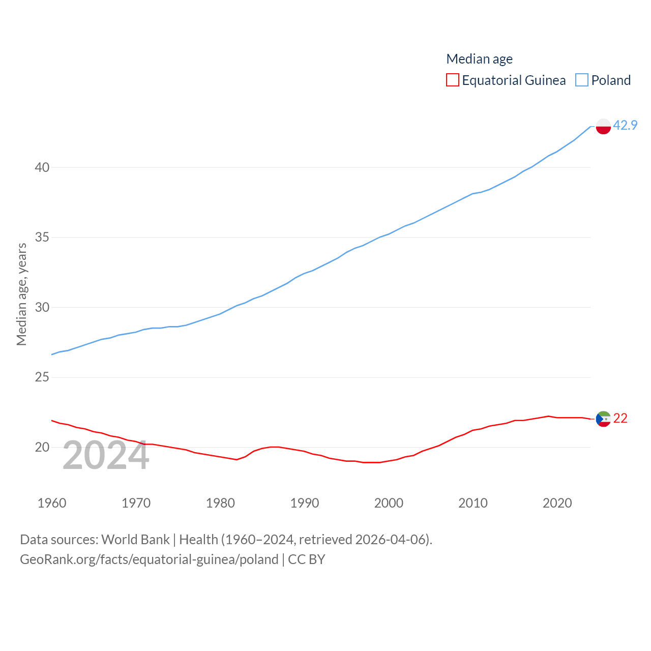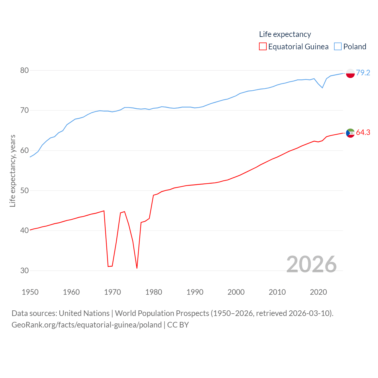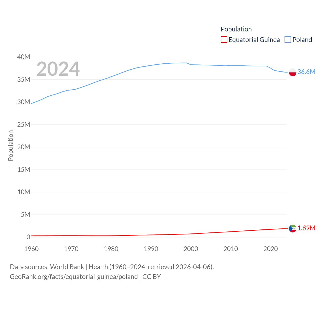 Equatorial Guinea has a population of 1.89M (ranked 148/197), compared with 36.6M in Poland (ranked 42/197). Equatorial Guinea's land area is 10,830 sq mi versus 118,252 sq mi for Poland (ranked 140th vs. 69th).