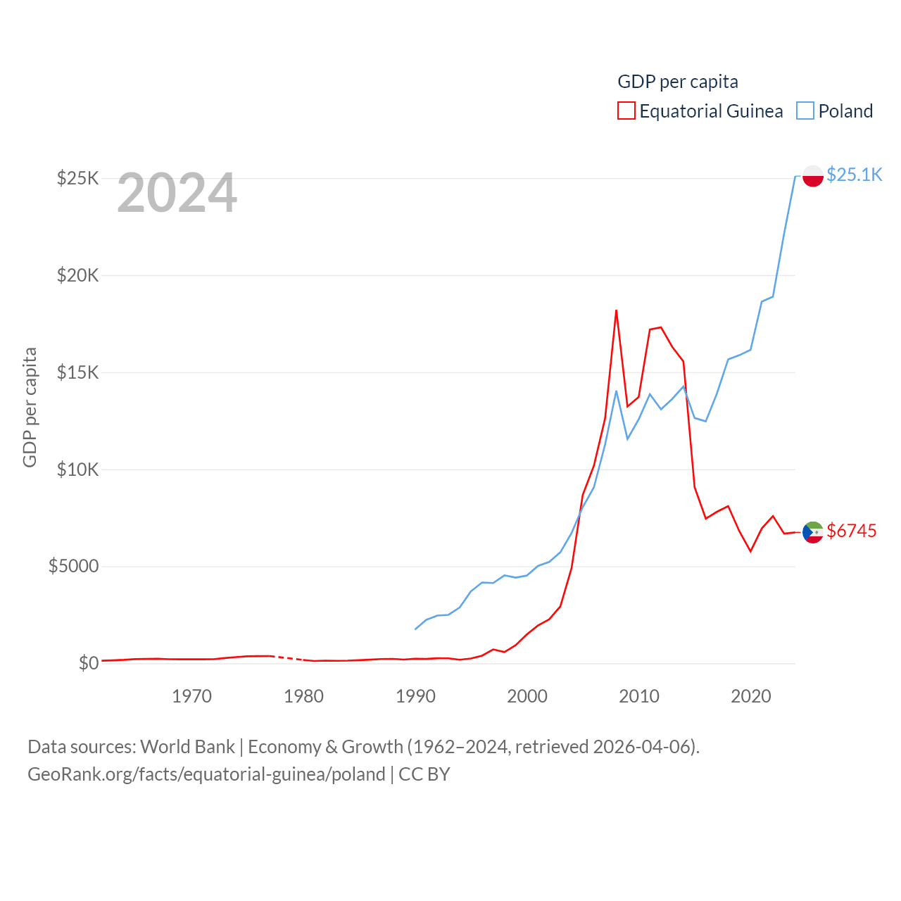 By GDP, Equatorial Guinea ranks 148/197 ($12.8B) and Poland ranks 21/197 ($918B). By GDP per capita, Equatorial Guinea ranks 106/197 ($6,745), while Poland ranks 48/197 ($25,104).
