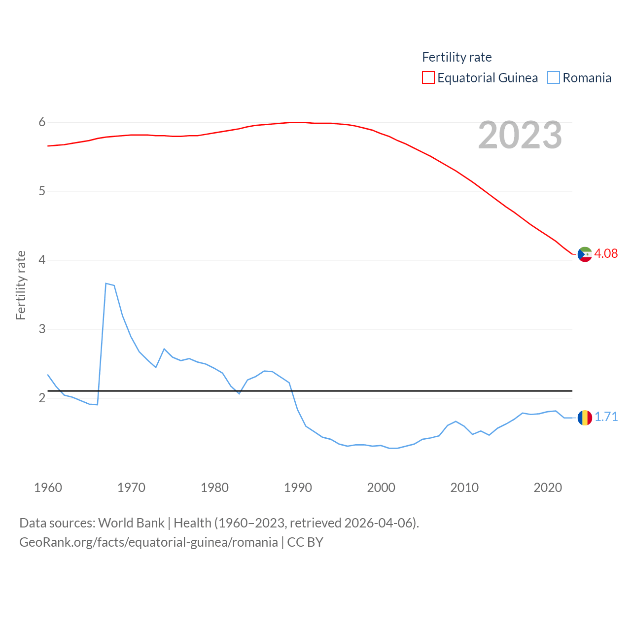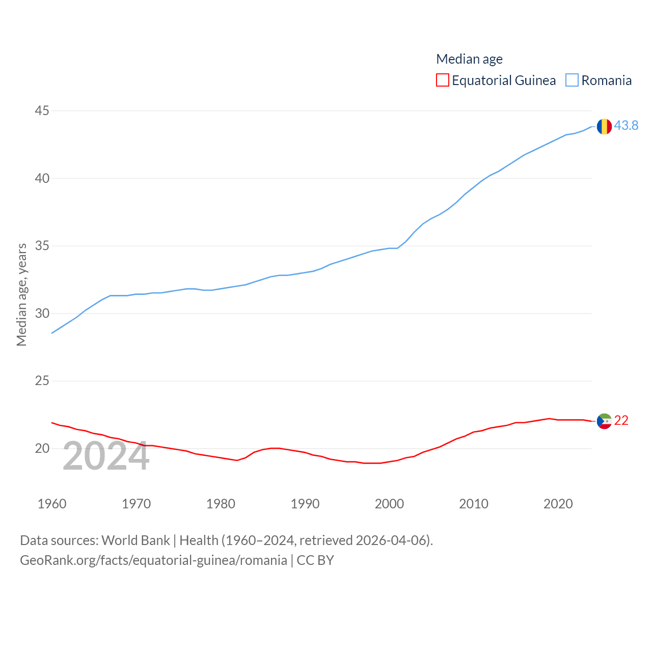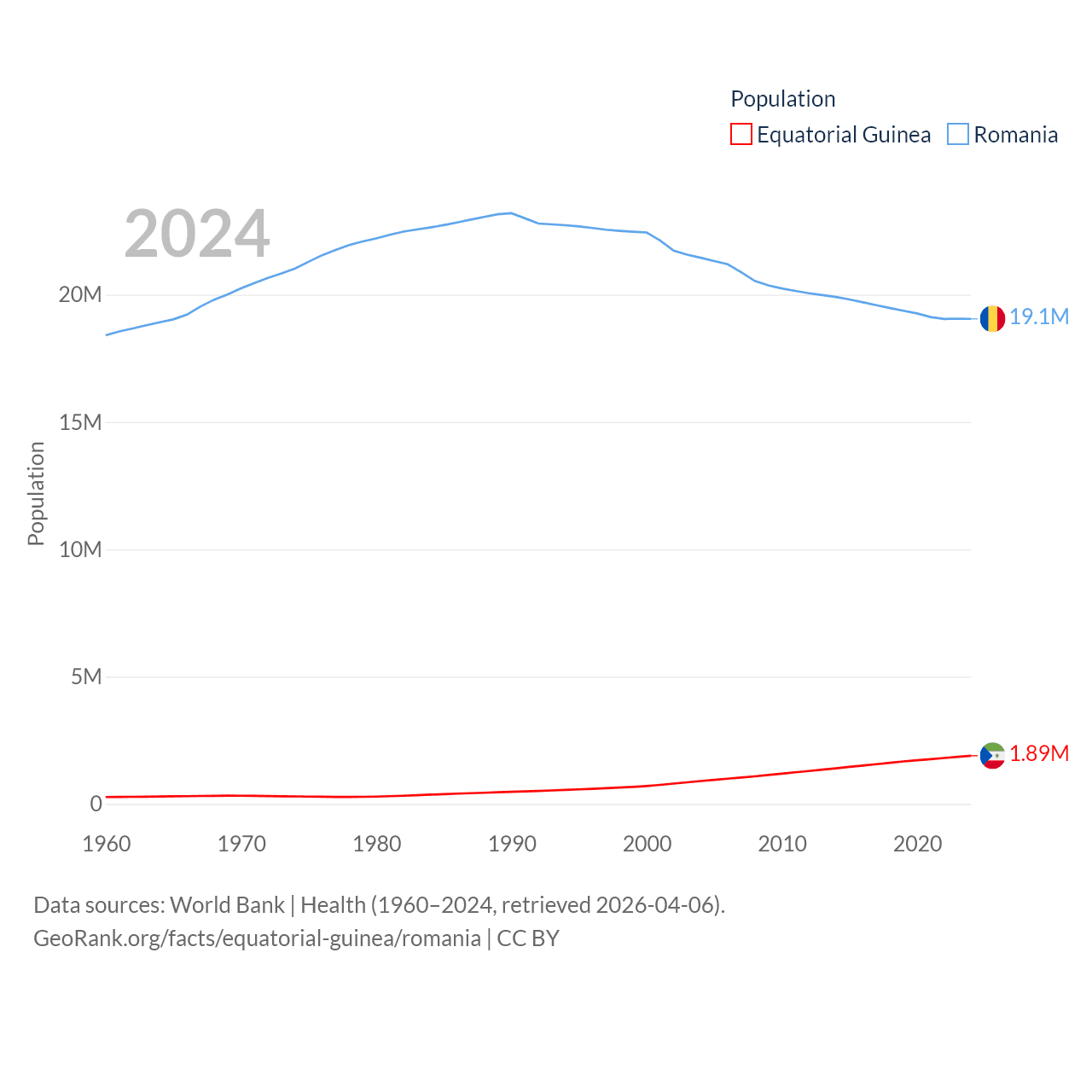Equatorial Guinea has a population of 1.89M (ranked 148/197), compared with 19.1M in Romania (ranked 67/197). Equatorial Guinea's land area is 10,830 sq mi versus 88,834 sq mi for Romania (ranked 140th vs. 80th).