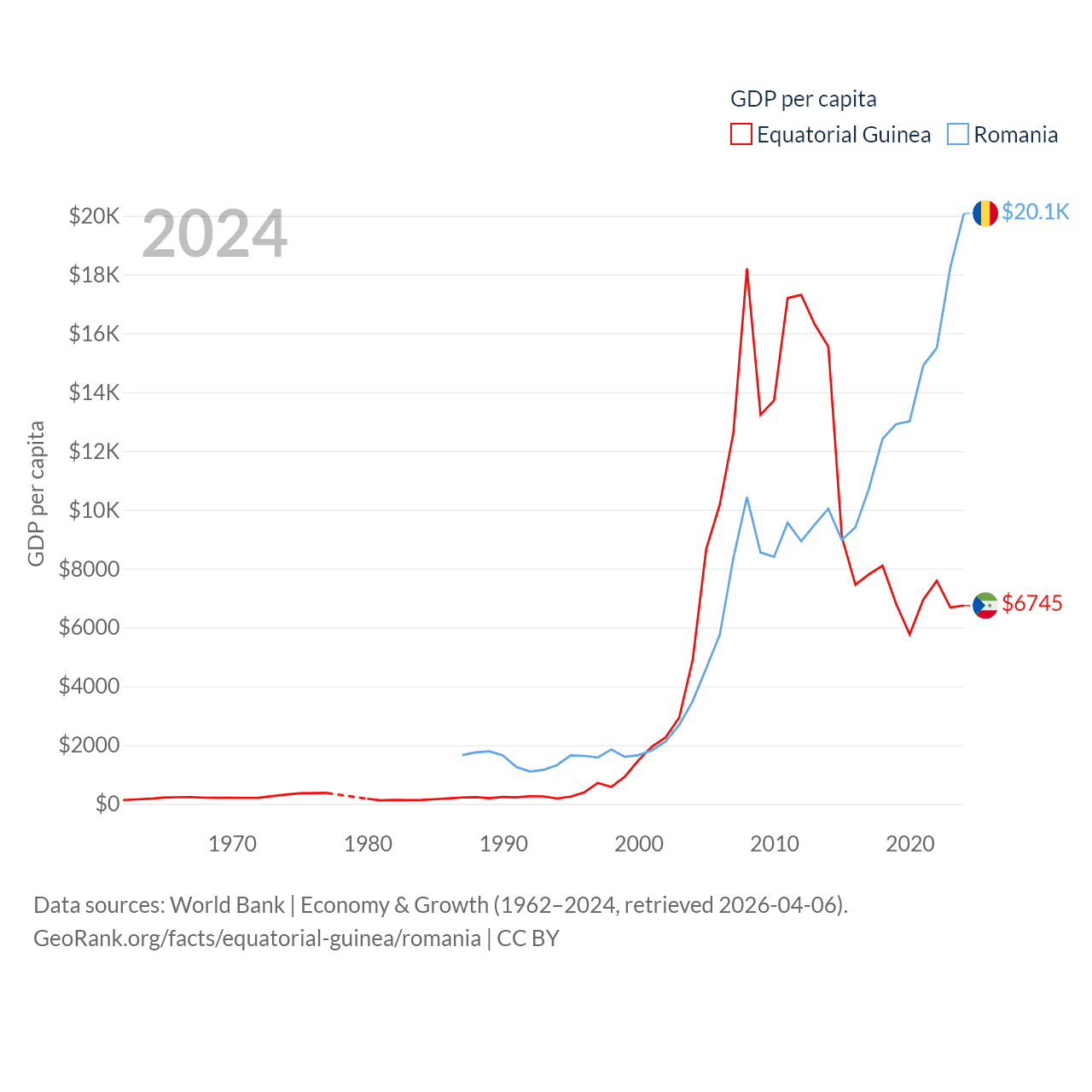 By GDP, Equatorial Guinea ranks 148/197 ($12.8B) and Romania ranks 42/197 ($383B). By GDP per capita, Equatorial Guinea ranks 106/197 ($6,745), while Romania ranks 58/197 ($20,080).