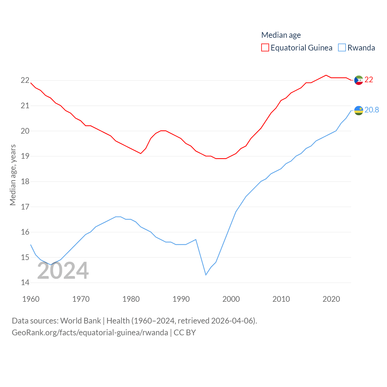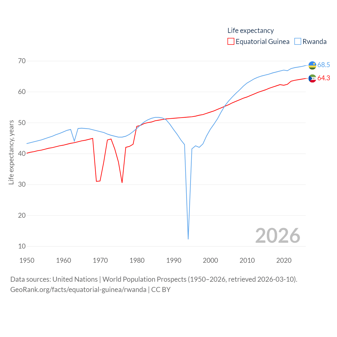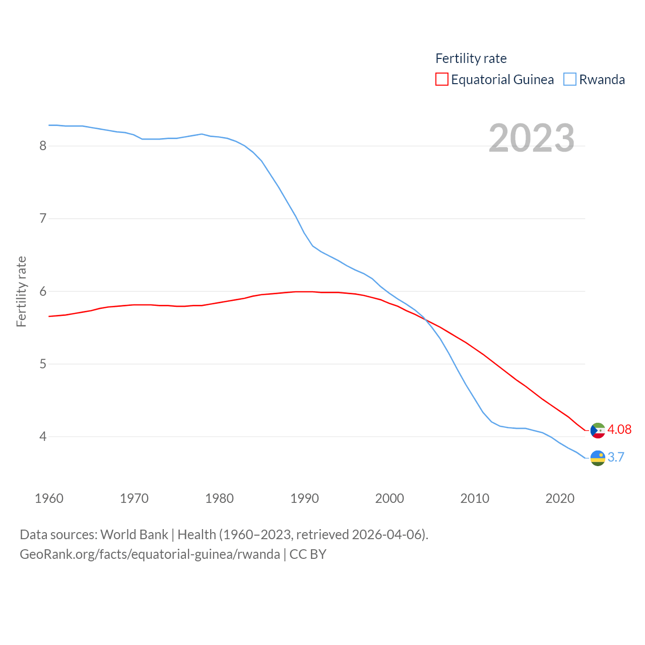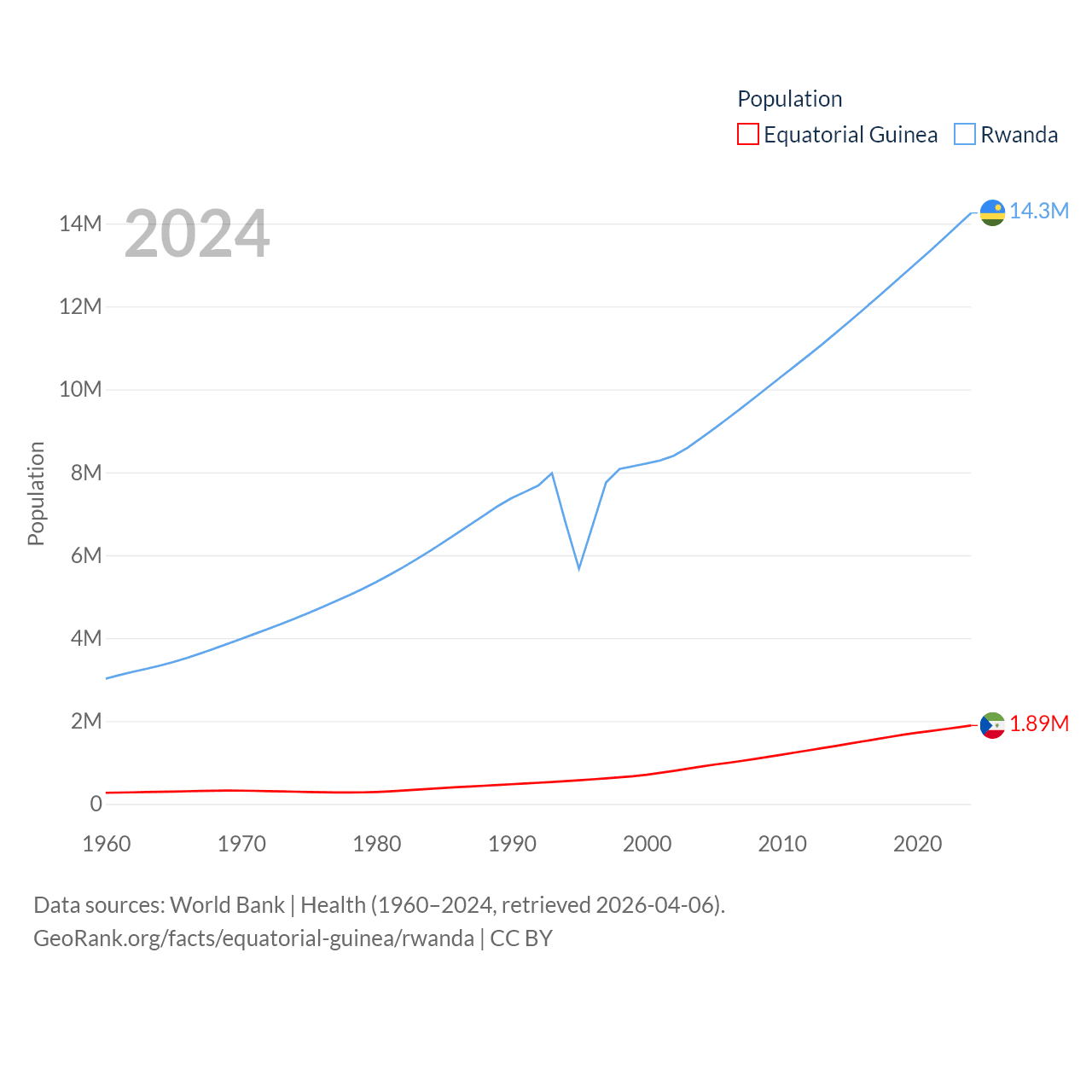 Equatorial Guinea has a population of 1.89M (ranked 148/197), compared with 14.3M in Rwanda (ranked 77/197). Equatorial Guinea's land area is 10,830 sq mi versus 9,525 sq mi for Rwanda (ranked 140th vs. 146th).