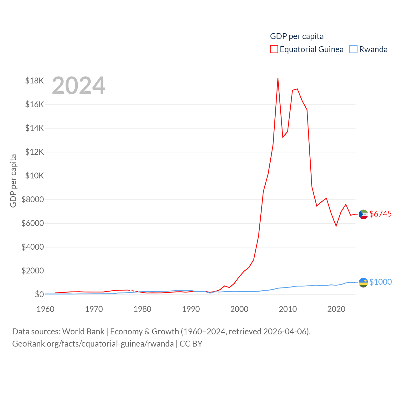 By GDP, Equatorial Guinea ranks 148/197 ($12.8B) and Rwanda ranks 144/197 ($14.3B). By GDP per capita, Equatorial Guinea ranks 106/197 ($6,745), while Rwanda ranks 178/197 ($1,000).