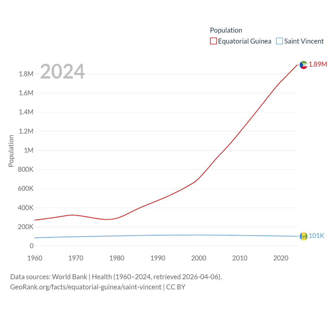 Equatorial Guinea has a population of 1.89M (ranked 148/197), compared with 101K in Saint Vincent (ranked 184/197). Equatorial Guinea's land area is 10,830 sq mi versus 150.6 sq mi for Saint Vincent (ranked 140th vs. 185th).