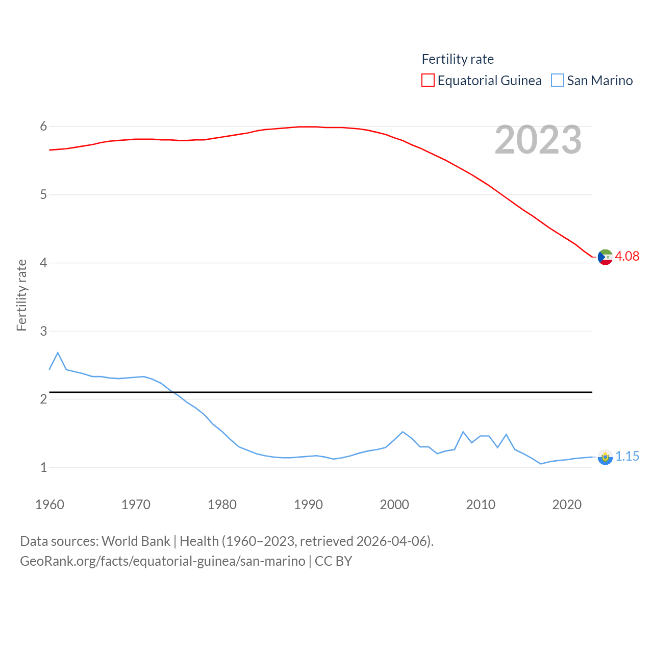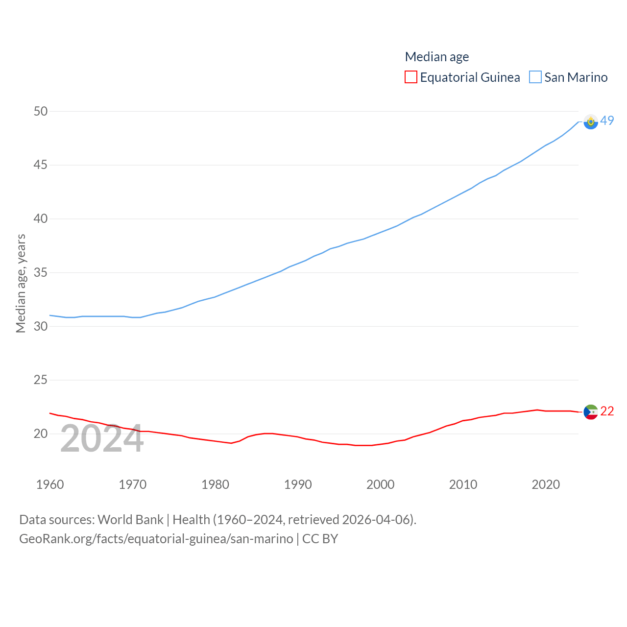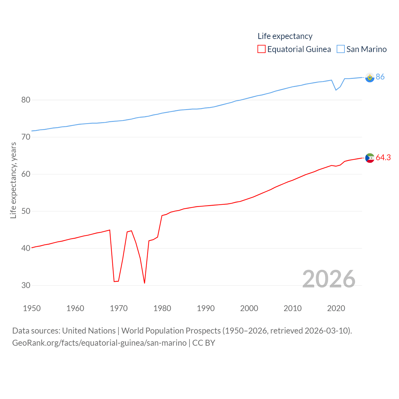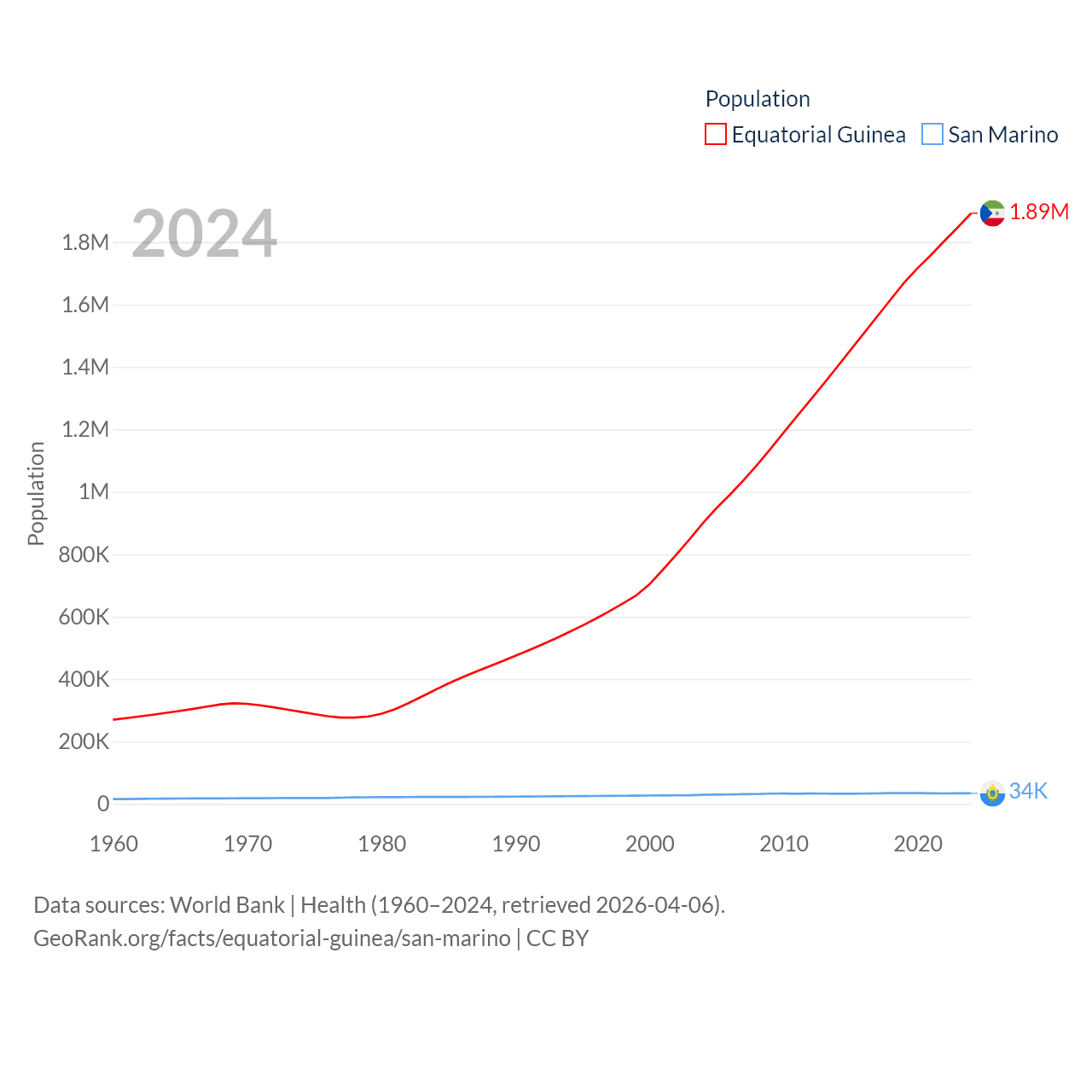 Equatorial Guinea has a population of 1.89M (ranked 148/197), compared with 34K in San Marino (ranked 193/197). Equatorial Guinea's land area is 10,830 sq mi versus 23.2 sq mi for San Marino (ranked 140th vs. 193rd).