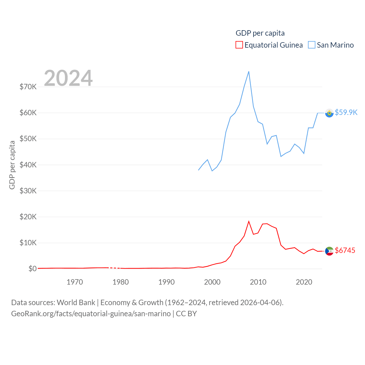 By GDP, Equatorial Guinea ranks 148/197 ($12.8B) and San Marino ranks 180/197 ($2.03B). By GDP per capita, Equatorial Guinea ranks 106/197 ($6,745), while San Marino ranks 15/197 ($59,880).