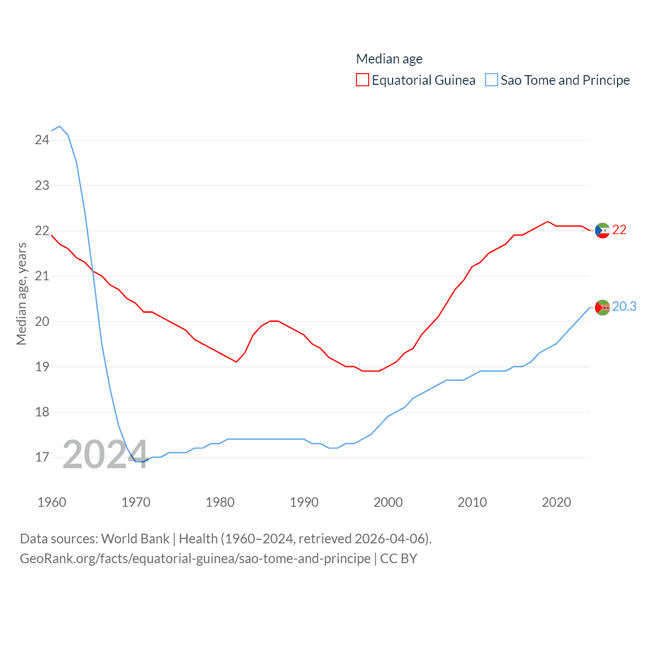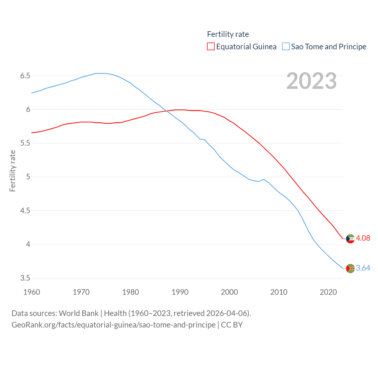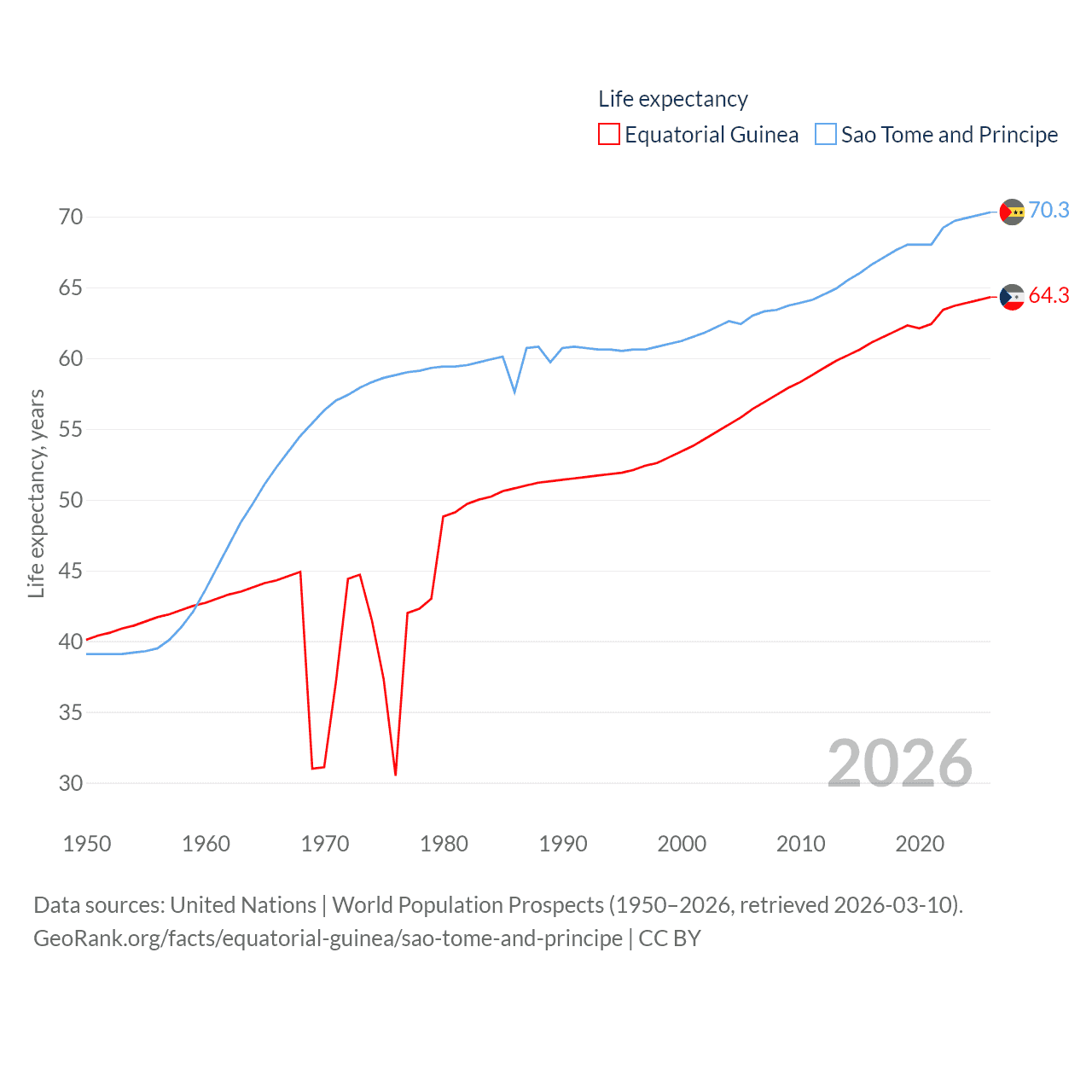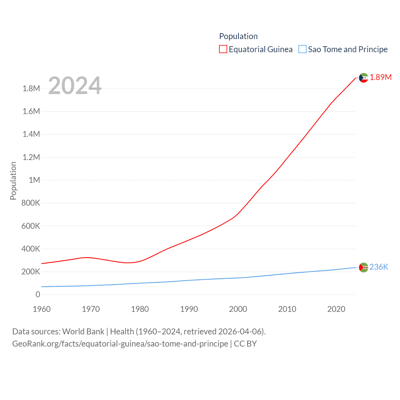 Equatorial Guinea has a population of 1.89M (ranked 148/197), compared with 236K in Sao Tome and Principe (ranked 176/197). Equatorial Guinea's land area is 10,830 sq mi versus 371 sq mi for Sao Tome and Principe (ranked 140th vs. 172nd).
