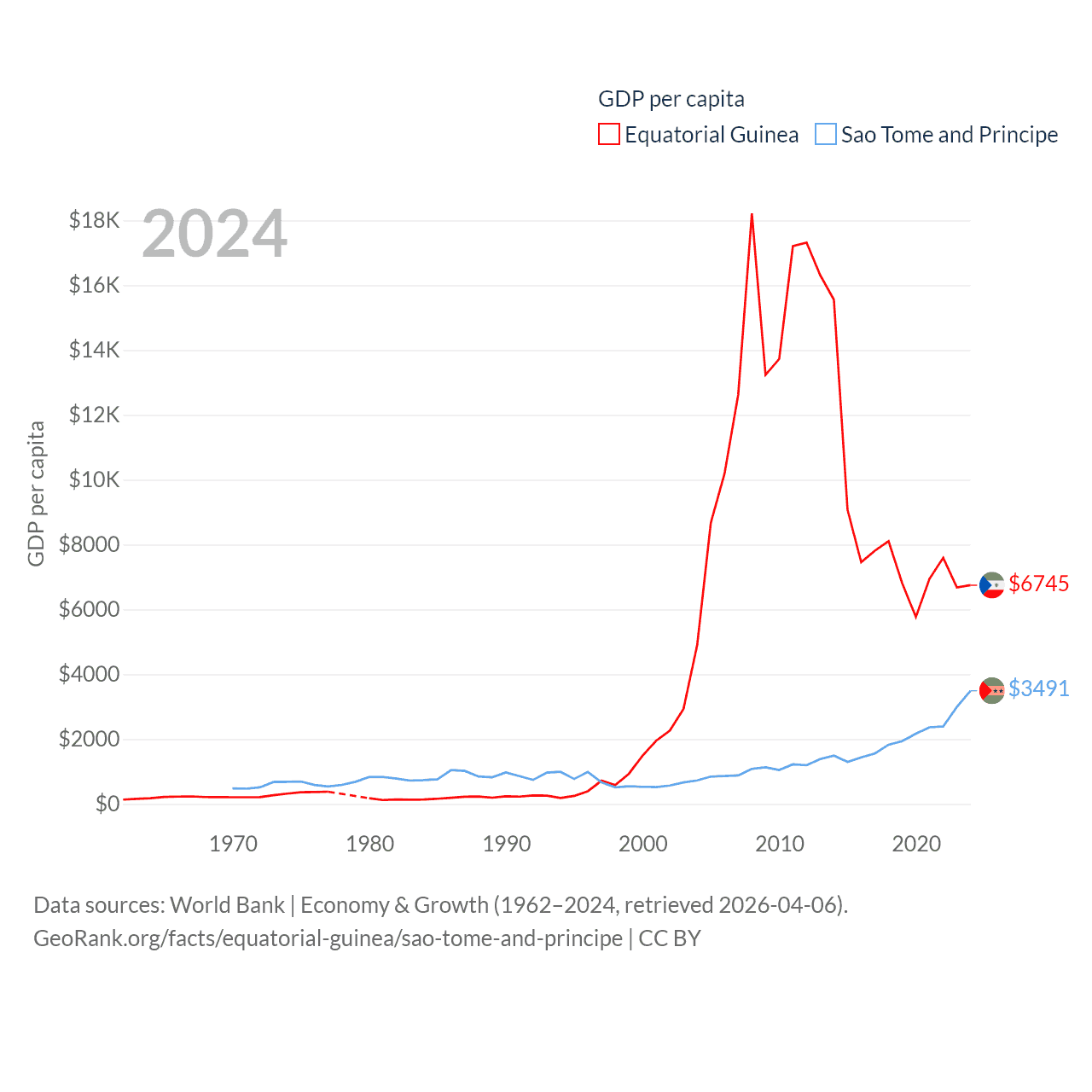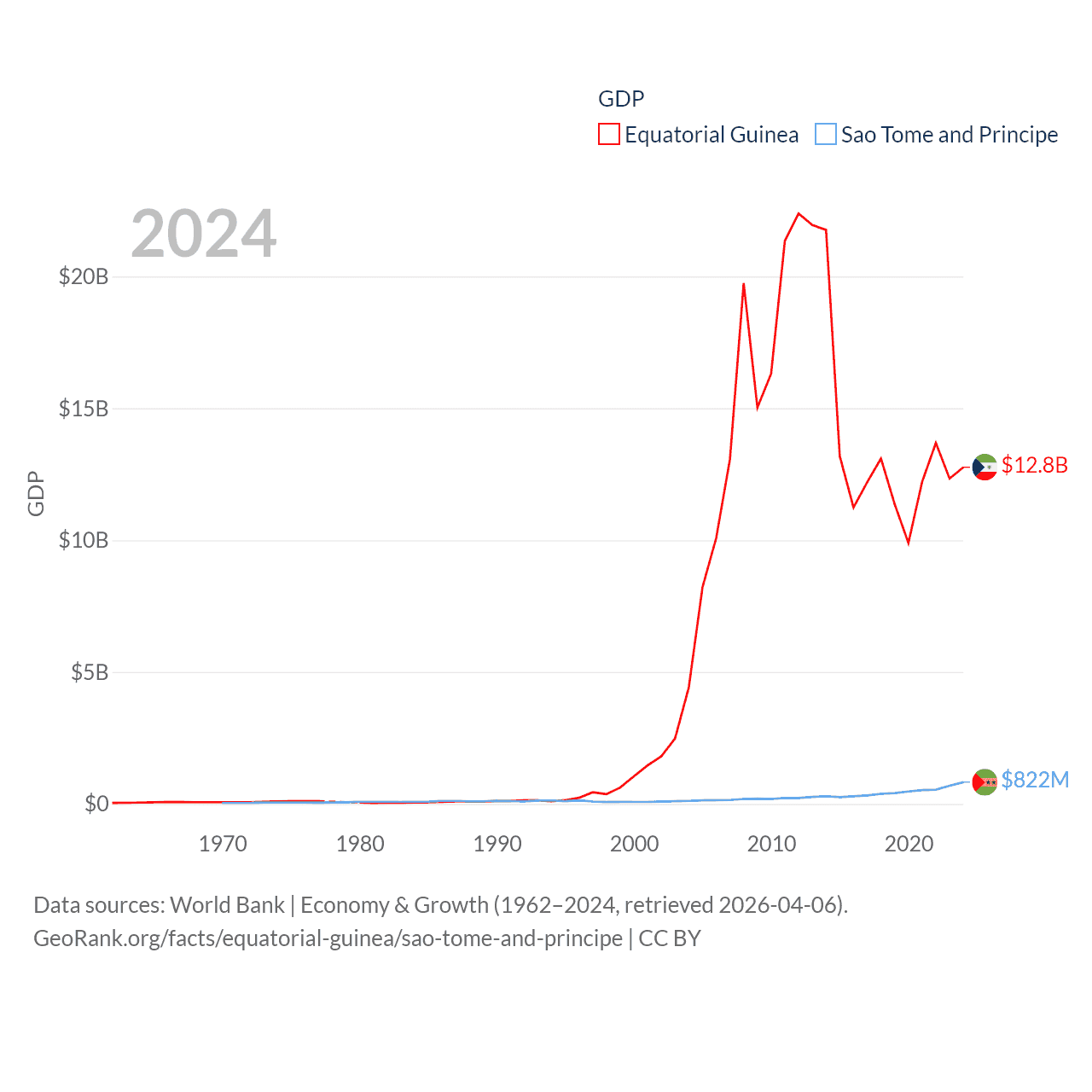 By GDP, Equatorial Guinea ranks 148/197 ($12.8B) and Sao Tome and Principe ranks 189/197 ($822M). By GDP per capita, Equatorial Guinea ranks 106/197 ($6,745), while Sao Tome and Principe ranks 134/197 ($3,491).
