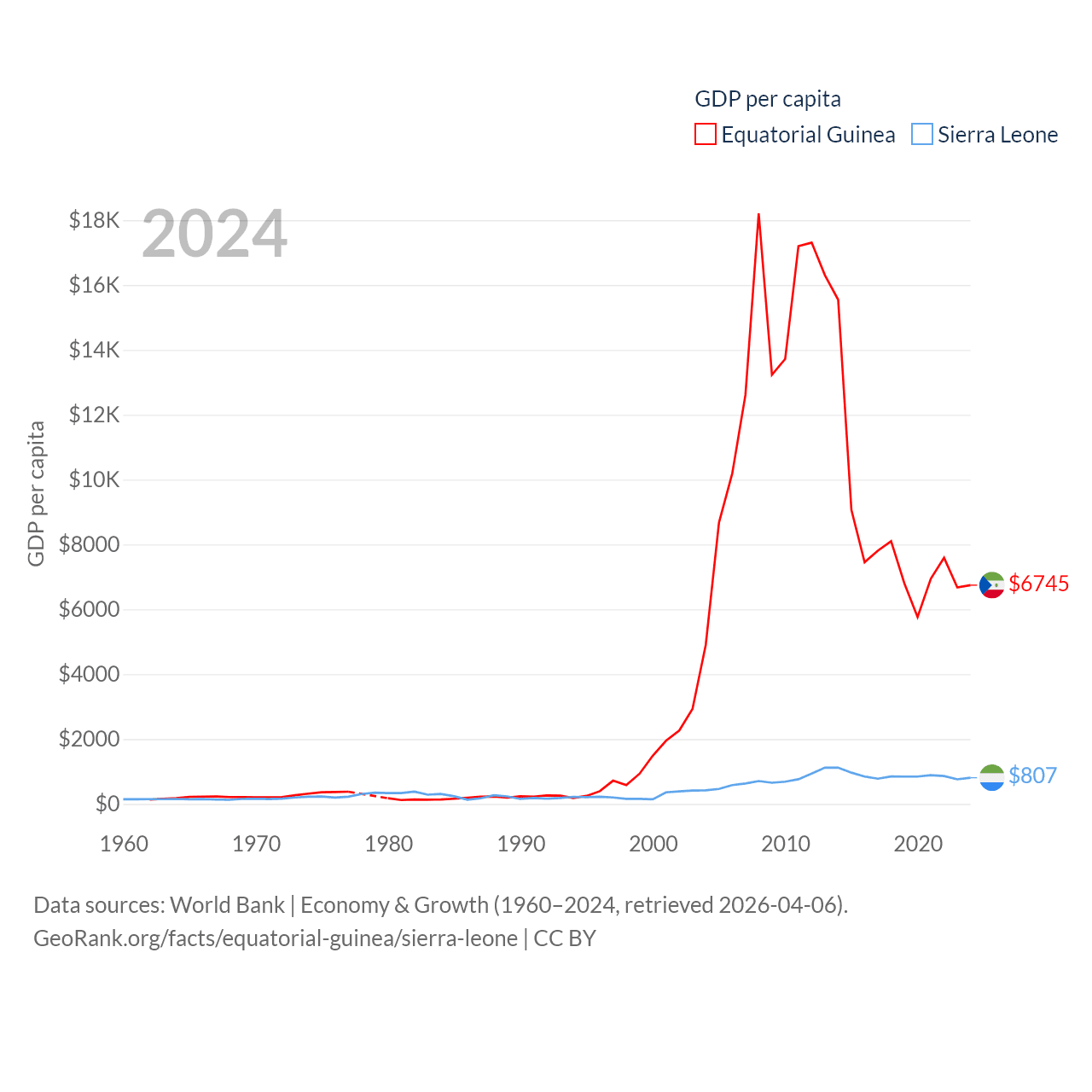 By GDP, Equatorial Guinea ranks 148/197 ($12.8B) and Sierra Leone ranks 160/197 ($6.97B). By GDP per capita, Equatorial Guinea ranks 106/197 ($6,745), while Sierra Leone ranks 186/197 ($807).
