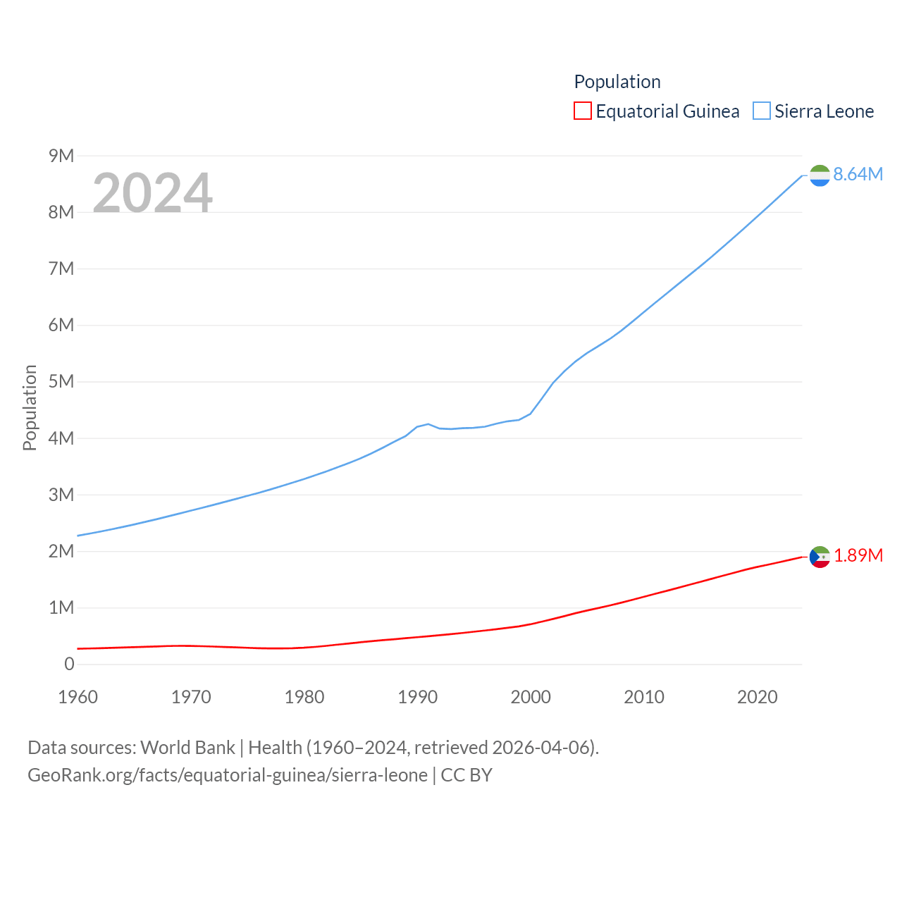 Equatorial Guinea has a population of 1.89M (ranked 148/197), compared with 8.64M in Sierra Leone (ranked 102/197). Equatorial Guinea's land area is 10,830 sq mi versus 27,869 sq mi for Sierra Leone (ranked 140th vs. 116th).